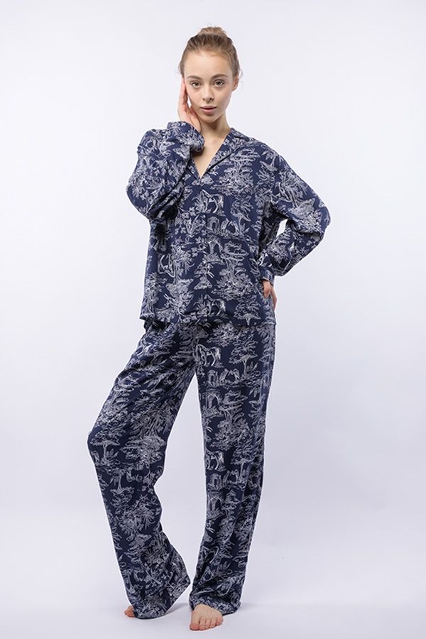 Домашний костюм из тканой вискозы состоит из рубашки и длинных широких брюк. Принт : «Туаль де Жуи» (Toile de Jouy) — это французская ткань с одноцветным рисунком в белых тонах на синем фоне, изображающим пасторальные сцены, пейзажи или сцены из жизни XVIII века. Рубашка с английским воротником, на пуговицах, с длинным рукавом без манжет. Брюки на резинке. Подгиб и строчка по низу рукава и рубашки и низу брюк. XS-XS(170-84-90), S-S(170-88-94), M-M(170-92-98), L-L(170-96-102), XL-XL(170-100-106)