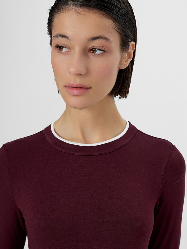 Модель прилегающего силуэта мягко подчеркивает фигуру, сохраняя свободу движений. Глубокий оттенок добавляет образу благородства, а круглая горловина с имитацией двойной обтачки и длинные рукава создают завершенный силуэт. Дизайн дополнен оригинальной деталью по низу платья и рукавов — имитацией поддетого платья, что придает модели стильную многослойность.