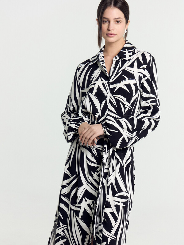 Элегантное платье женское, полуприлегающего силуэта с широким поясом. Выполнено в модной расцветке. Модель из нежной 100% вискозы. Горловина круглой формы с воротником. Спереди выполнена центральная застежка на пуговицы. Рукав длинный, слегка присборен. Платье расширяется к низу. Длина ниже колена. Невесомое, отлично подойдет для работы, учебы и на каждый день. Представлено в нескольких расцветках. Идеально для весенне-летнего сезона. Откройте для себя широкий ассортимент наших платьев — это модели в различных цветах и вариантах длины. В них вы будете выглядеть элегантно и женственно, они украсят вашу фигуру, подчеркнут ее достоинства. Каждое платье из нашей коллекции является уникальным и добавит шарма вашему образу!