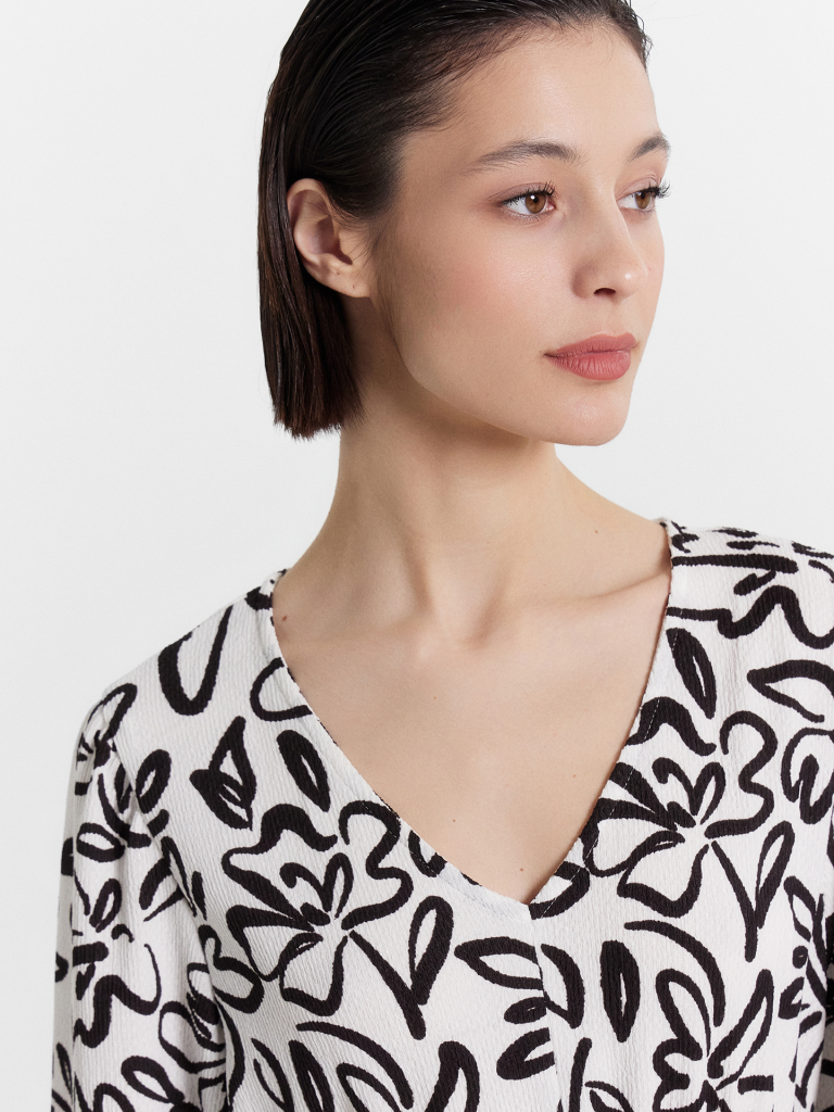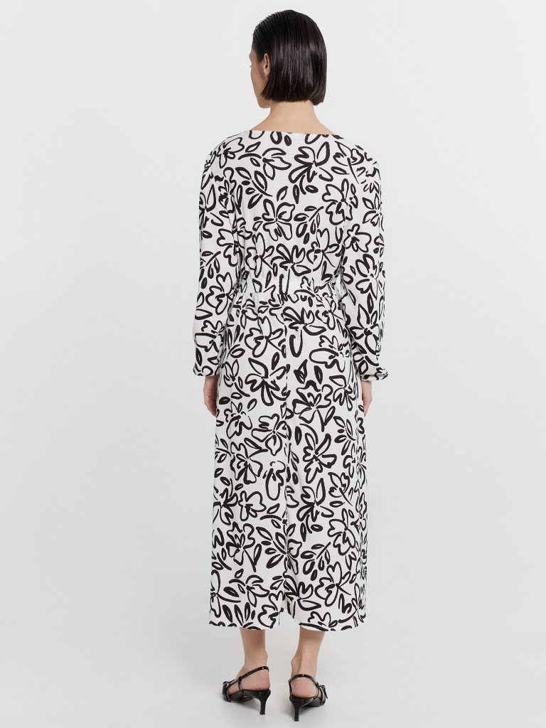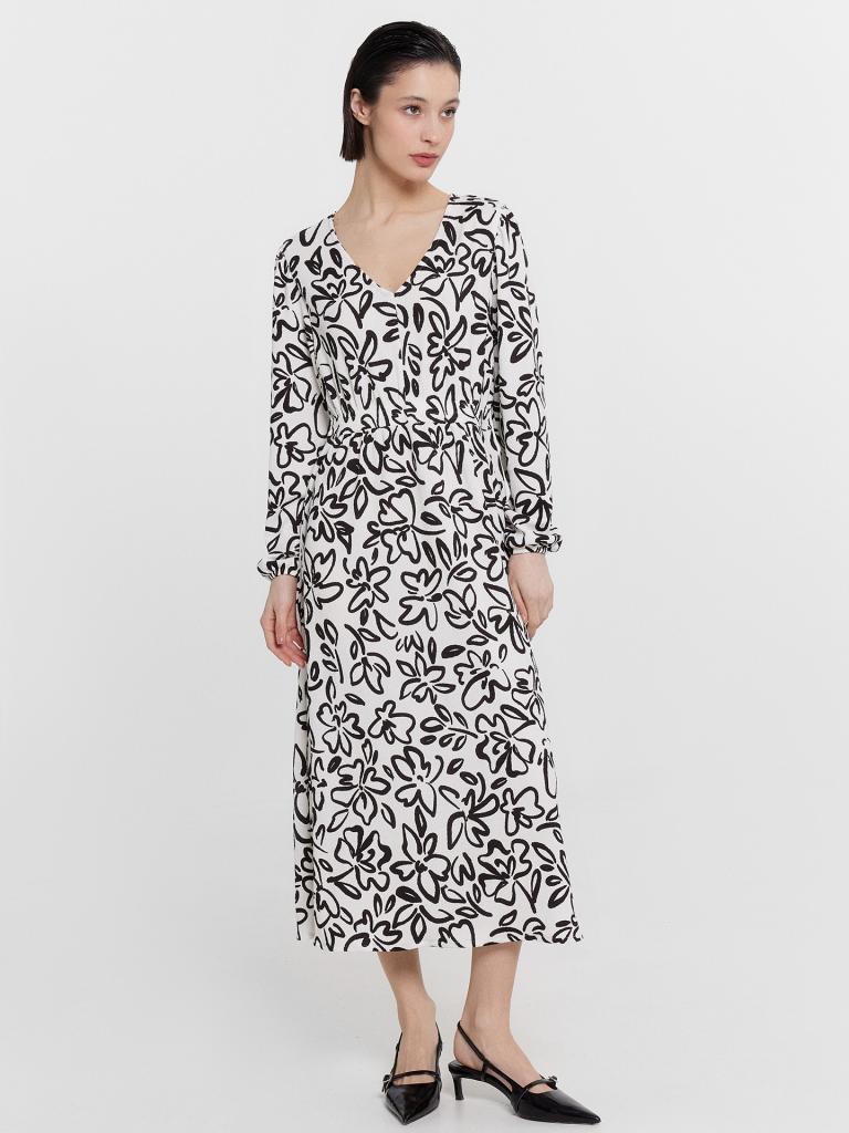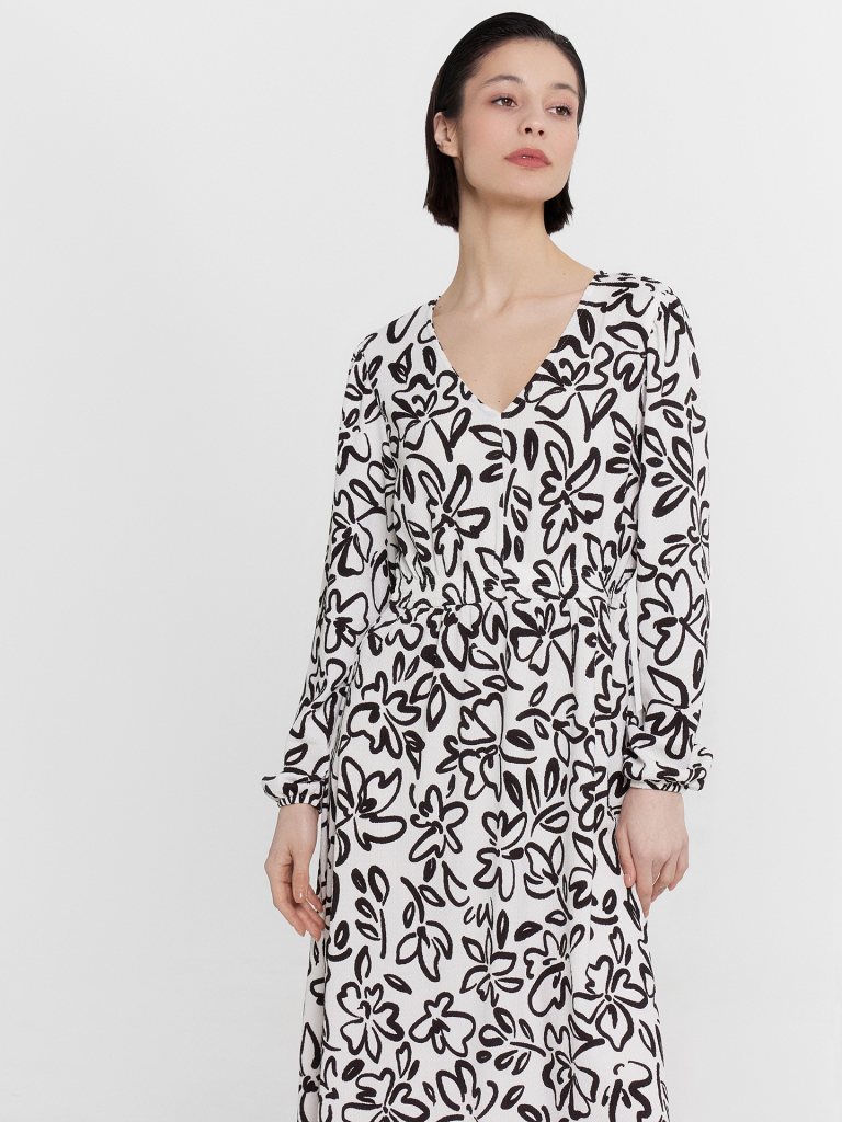 Платье полуприлегающего силуэта из ткани рошель. Горловина V-образной формы. Платье отрезное по талии, с эластичной тесьмой внутри. По эластичной тесьме проложены отделочные строчки. По детали переда средний шов. Детали спинки со средним швом. Рукав втачной, длинный. По окату слегка присборен. Длина рукава 3\4, по низу рукава настрочена эластичная тесьма которая делает сборку. Низ платья расширяется к низу. Длина платья ниже колена.