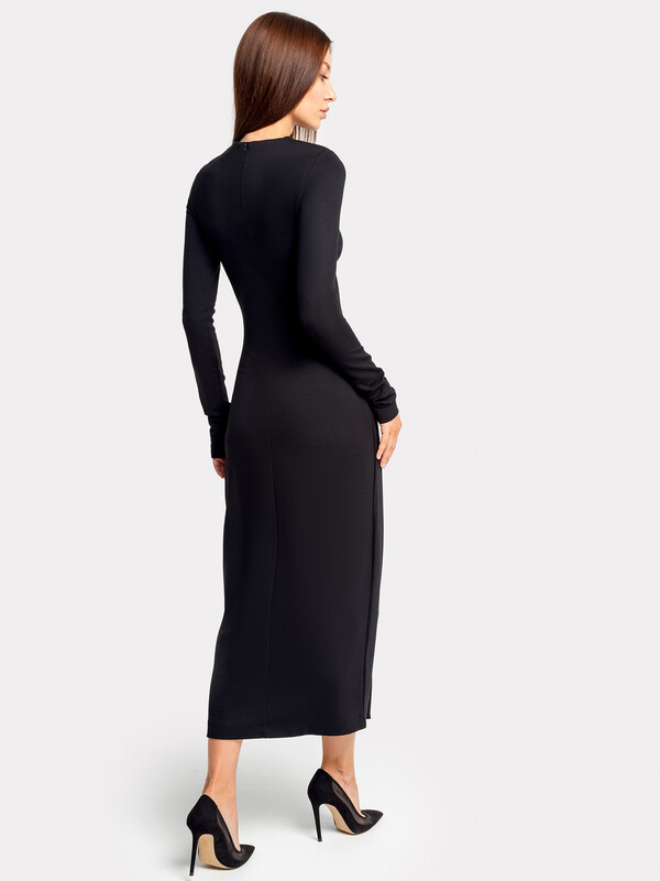 Эффектное женское платье облегающего силуэта. Фигурный вырез спереди и потайная застежка-молния на спинке добавляют элегантности, а удлиненные рукава, слегка расширяющиеся к низу, придают модели стильный акцент. Это платье идеально подходит для создания роскошных образов на любые торжественные мероприятия. Дополните его аксессуарами и изящной обувью на каблуке, чтобы завершить праздничный look. Позвольте себе сиять в этом платье и создайте незабываемые моменты на праздничных вечерах!