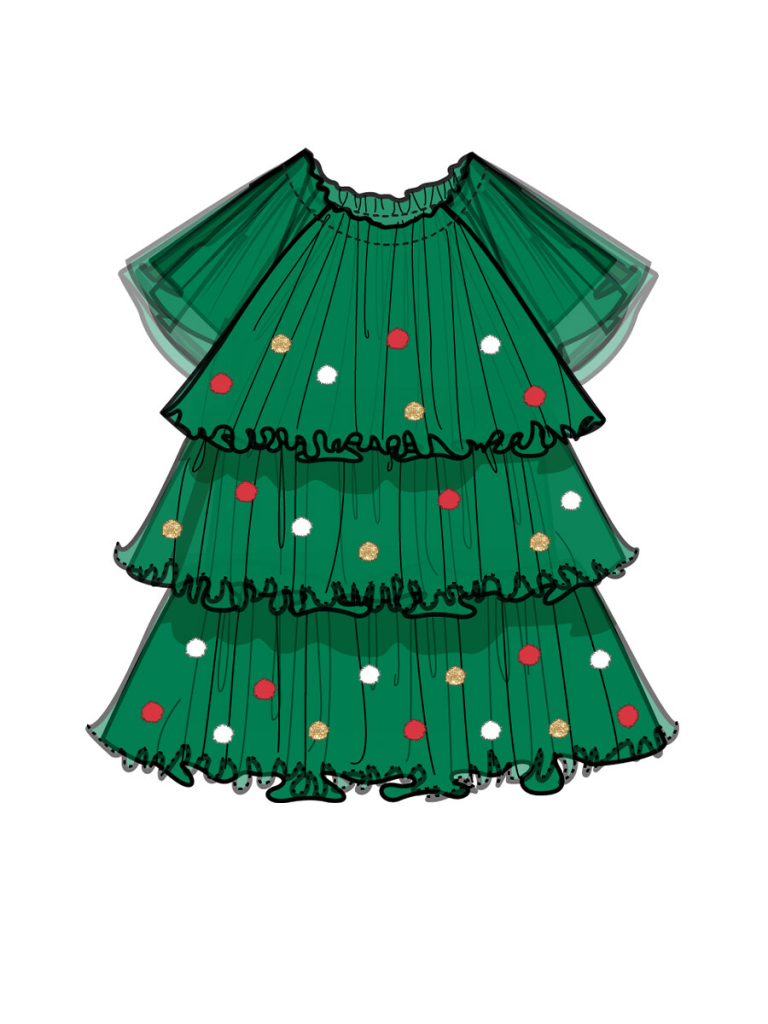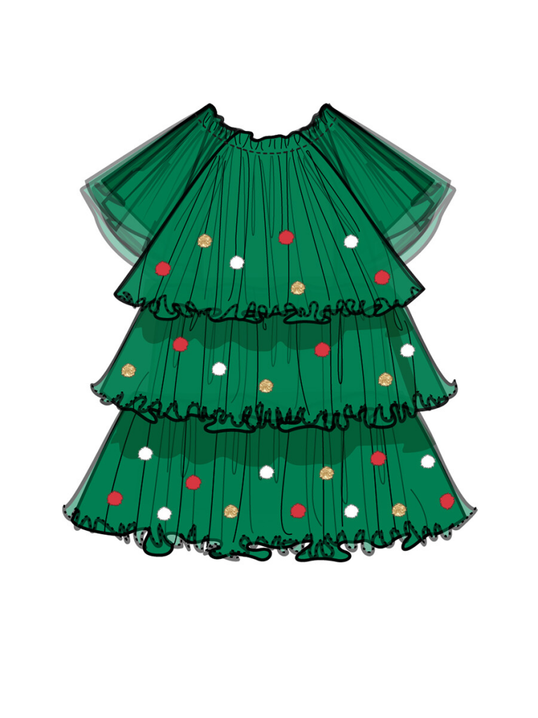 Платье карнавальное - ёлочка. Подкладка из трикотажа с высоким содержанием хлопка 95%. Благодаря наличию эластана в составе ткани, изделие держит форму и меньше мнется. Без застежек. Сверху мягкая сетка, декорированная разноцветными помпонами.