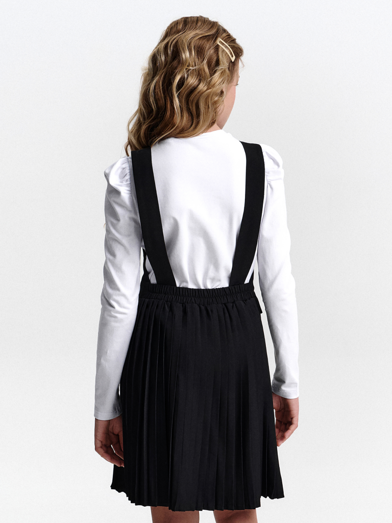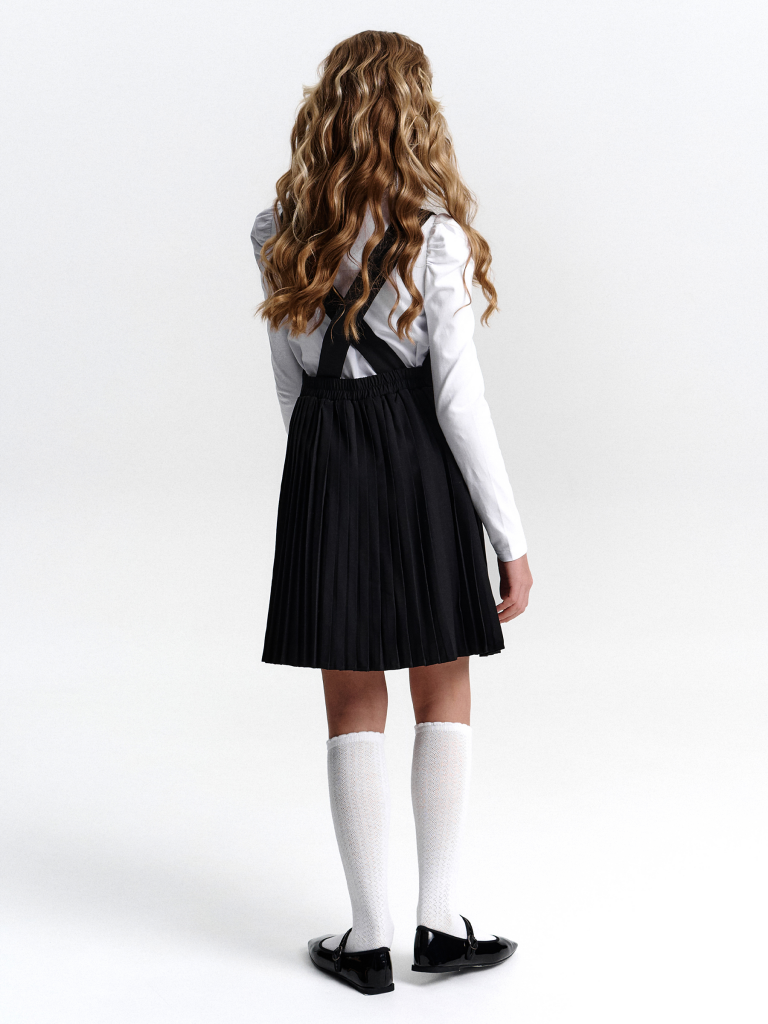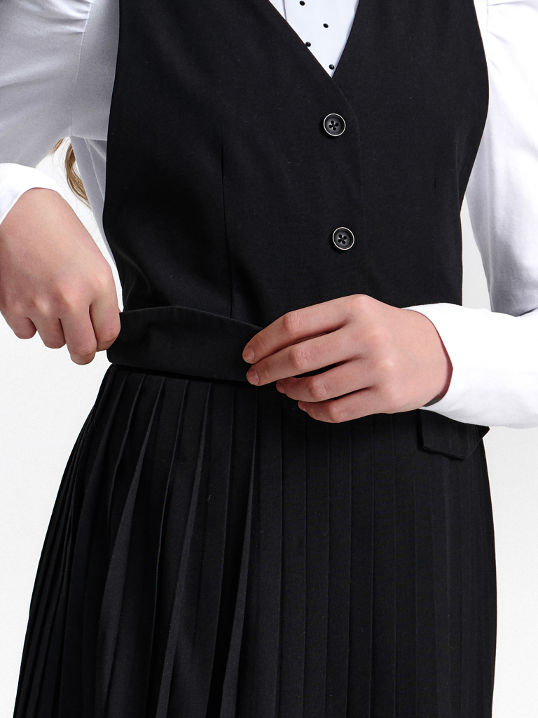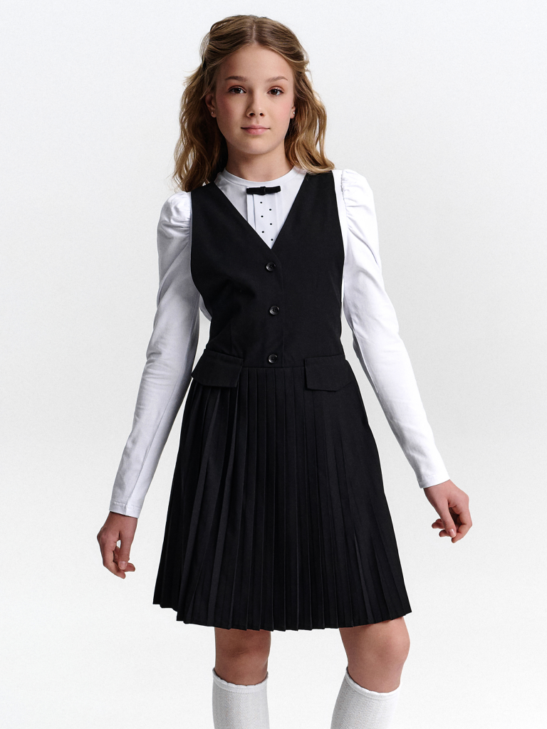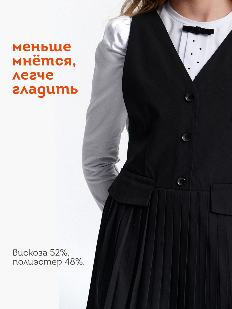 Швейный сарафан с юбкой в мелкую плиссировку — удобный и стильный выбор для школы и не только. Мелкие складки шириной 5 мм создают аккуратный, ровный рисунок, который не мнётся и сохраняет форму даже после долгого учебного дня. Верх сарафана — жилет с застёжкой на пуговицы спереди. Спинка с перекрещивающимися лямками регулируется по длине, чтобы сарафан идеально сидел на ребёнке любого роста. Лямки крепятся к юбке на потайные пуговицы, что обеспечивает надёжную фиксацию и комфорт при движении. Декоративные клапаны на линии талии придают школьному образу стиль и аккуратность. Юбка сзади на внутренней резинке — она помогает сарафану удобно сидеть на талии, не сползать и не мешать во время уроков и активных перемен. Сшит из смесовой ткани — практичный материал, который не мнётся, дышит и легко стирается. Сарафан прослужит долго, сохраняя аккуратный вид как в школе, так и в повседневной жизни. Выбирайте нужный размер по таблице размеров на фото. Цвет товара на экране вашего устройства может отличаться от цвета изделия вживую.