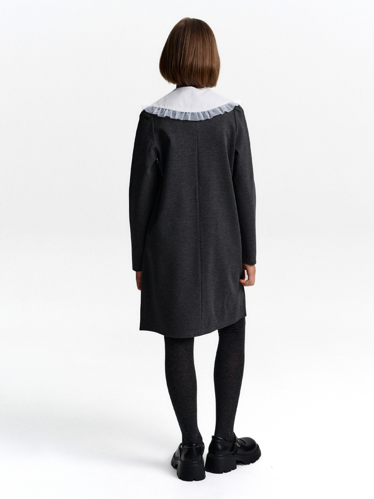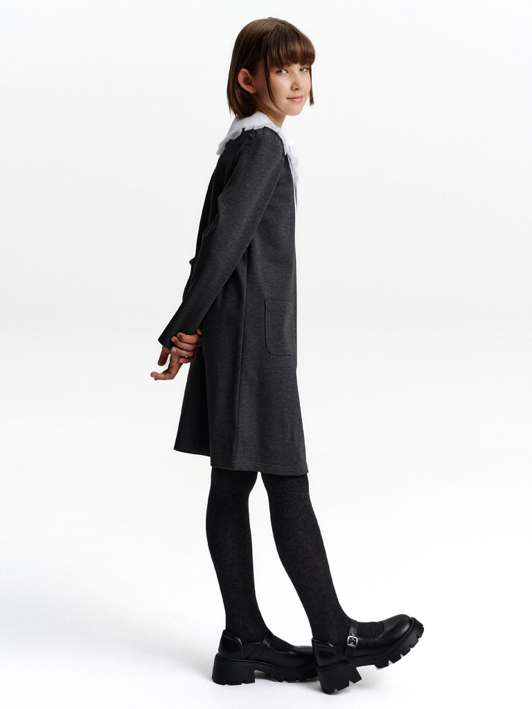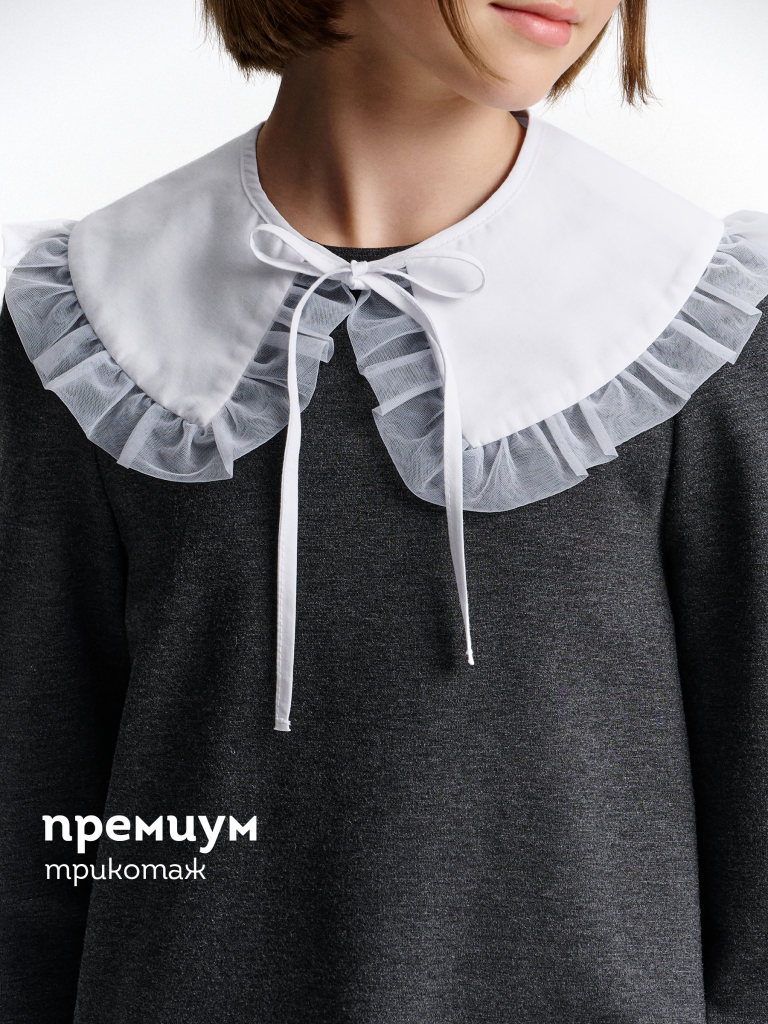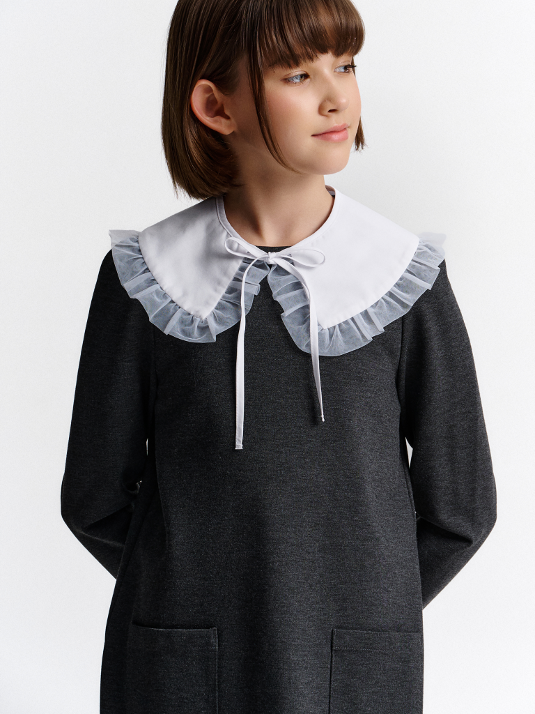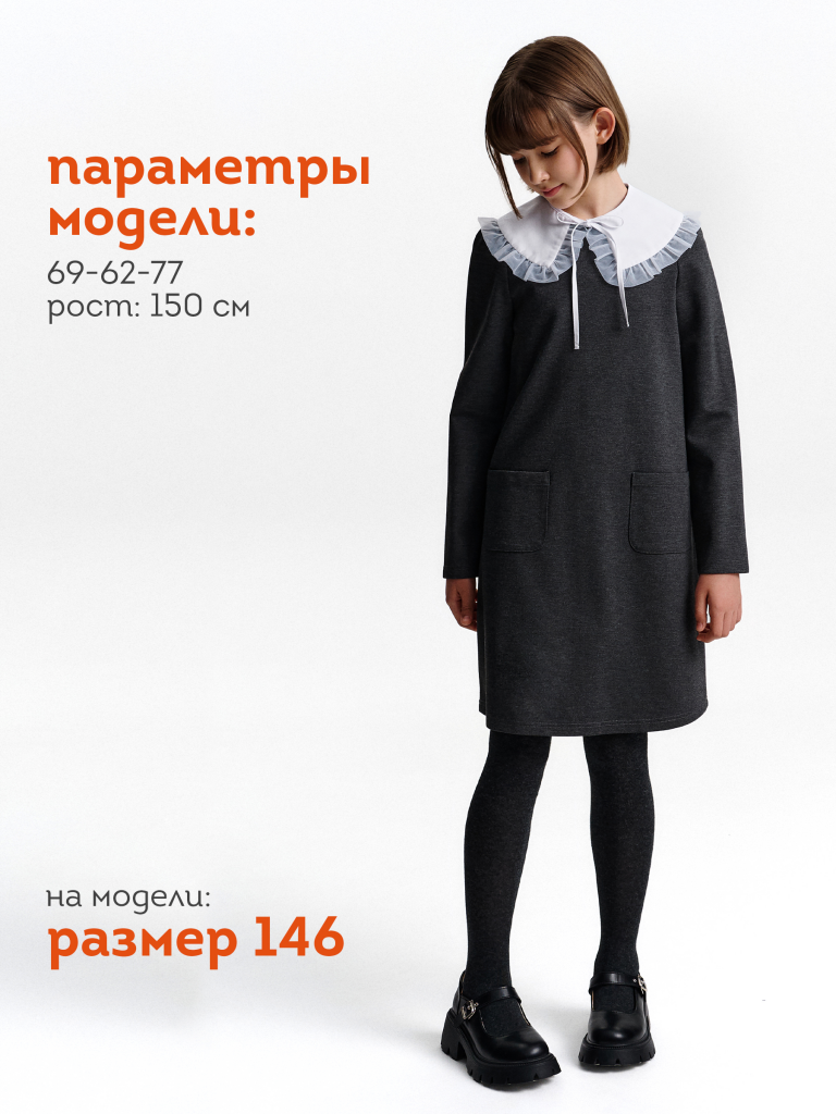 Идеальное платье для школы и не только! Стильное платье А-силуэта с длинными рукавами — настоящая находка для гардероба школьницы. Удобный крой не сковывает движений, а продуманные детали делают образ аккуратным и практичным. Застёжка сзади на пуговицу и небольшой разрез на спинке позволяют легко и быстро надевать платье через голову — особенно удобно в школьной суете. А в старших размерах (12–14 лет) предусмотрены вытачки для лучшей посадки по фигуре. Отдельная любовь — накладные кармашки спереди. Они не только украшают платье, но и становятся настоящей «тайной зоной» для мелочей: записки от подруг, заколки или маленький сюрприз. Съёмный воротничок на мягких завязках, украшенный кружевом, превращает повседневный наряд в почти праздничный. Надо — носим с ним, хочется проще — легко снимается. Платье выполнено из мягкого хлопкового трикотажа с добавлением полиэстера: оно дышит, держит форму, не мнётся и легко стирается — что особенно важно для школьной формы. Комфорт, стиль, универсальность — всё в одном платье, которое хочется носить каждый день! Используйте таблицу размеров на фотографии, чтобы выбрать подходящий размер. Обратите внимание, что цвет товара на экране вашего устройства может отличаться от реального.
