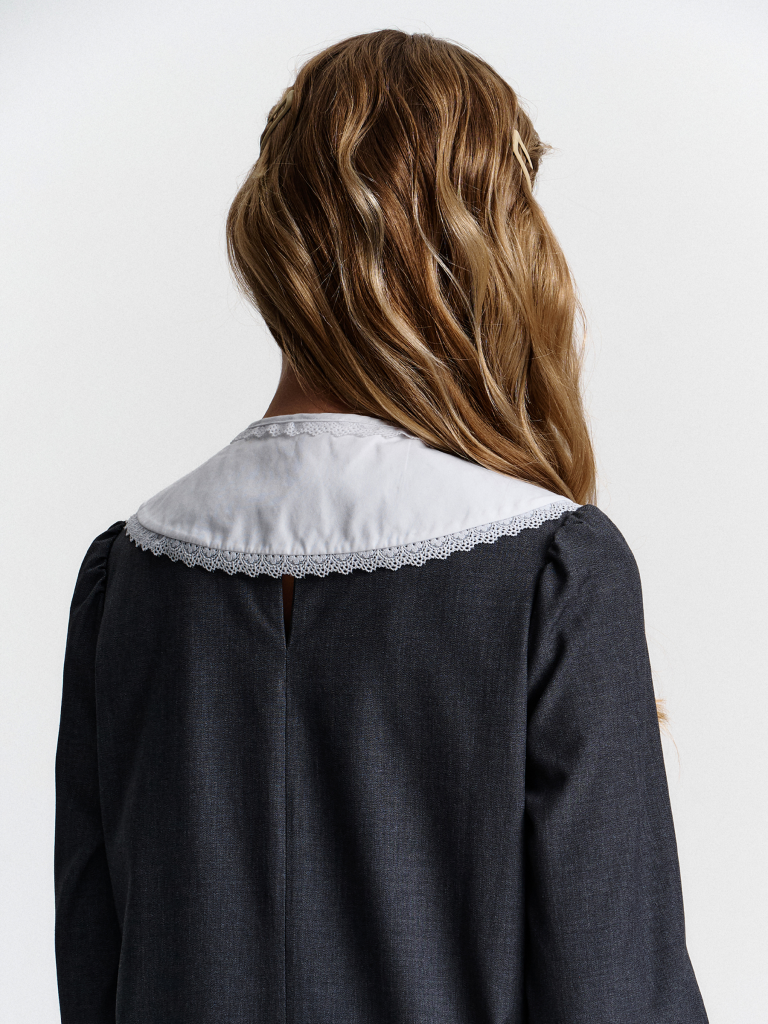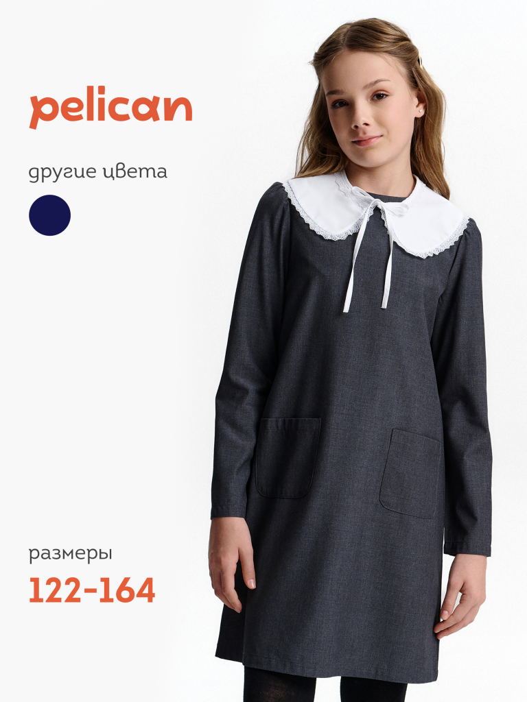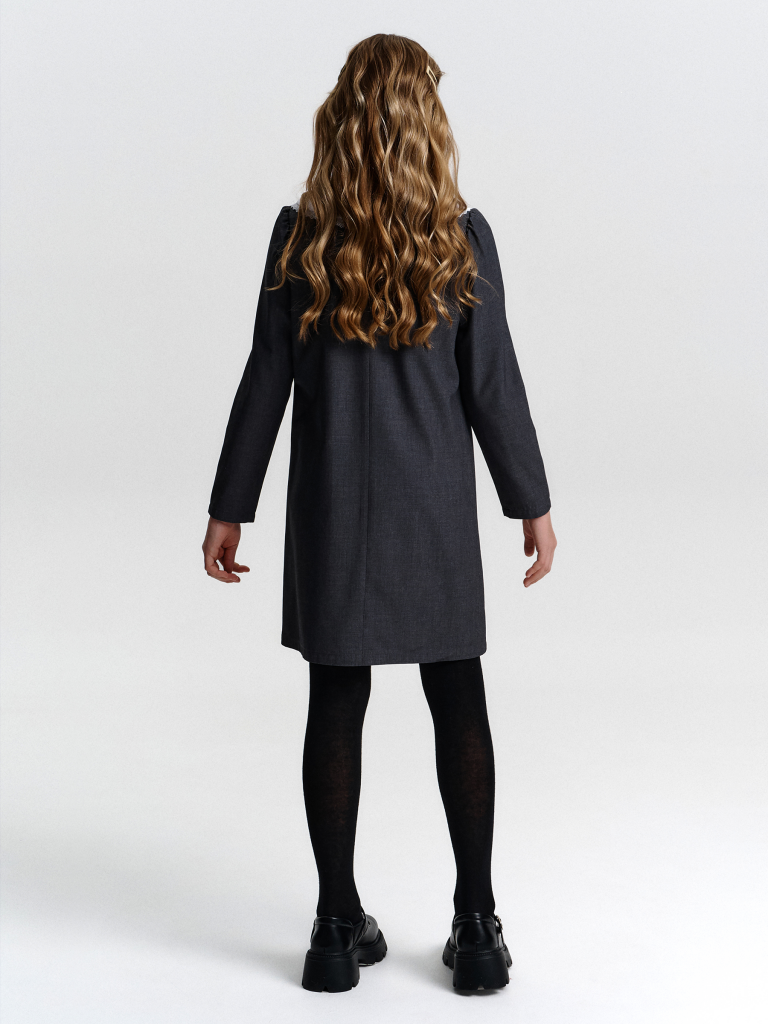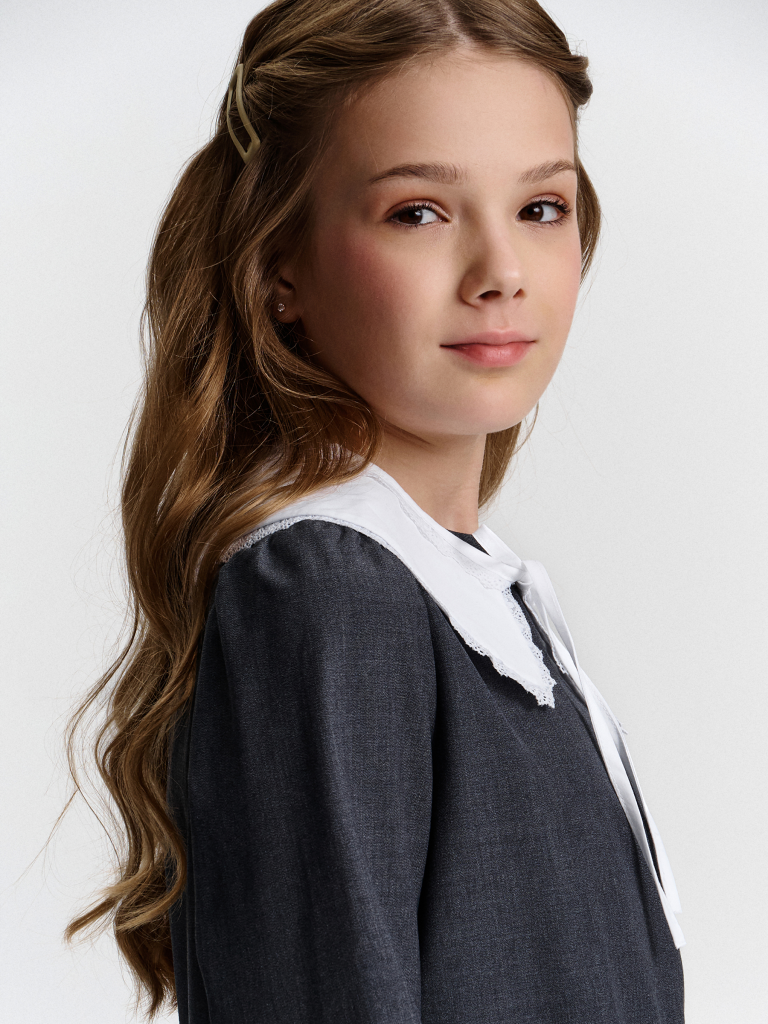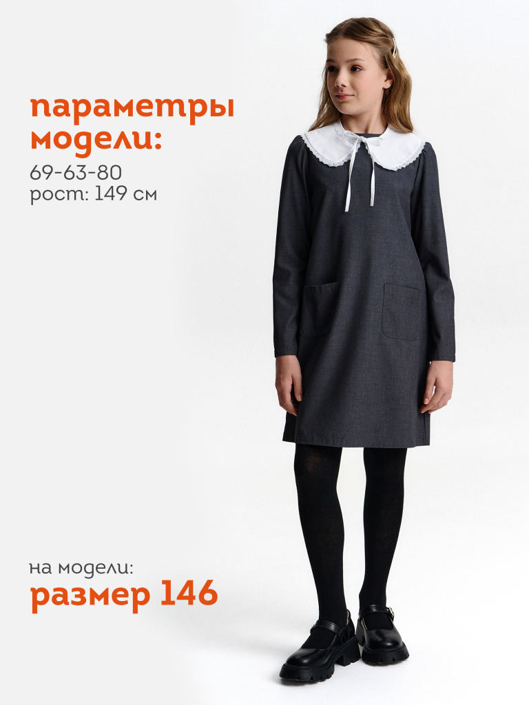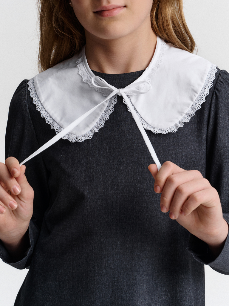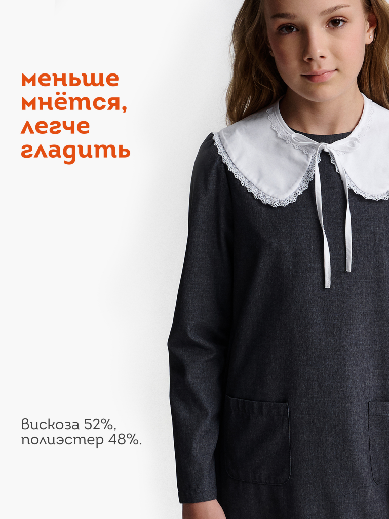 Школьное платье А-силуэта — строгость формы и комфорт на каждый день. Лаконичный дизайн, продуманный крой и съёмный декоративный воротник — модель, которая подойдёт и для школы, и для повседневной носки после уроков. Свободный силуэт с лёгким расширением к низу обеспечивает свободу движения и аккуратный внешний вид. Нагрудные вытачки и средний шов на спинке улучшают посадку и делают платье более структурированным. Два накладных кармана спереди со скруглёнными краями — удобно и функционально. Рукав прямой, втачной, с лёгкой сборкой — сидит аккуратно, не сковывает. Плечо чуть укорочено, что придаёт современный силуэт. Горловина круглая, с застёжкой на петлю и пуговицу по спинке — просто надевать самостоятельно. Съёмный воротник украшен рюшей из кружева. С воротником — строгий школьный образ, без него — повседневное платье. Выбирайте нужный размер по таблице размеров на фото. Цвет товара на экране вашего устройства может отличаться от цвета изделия вживую.