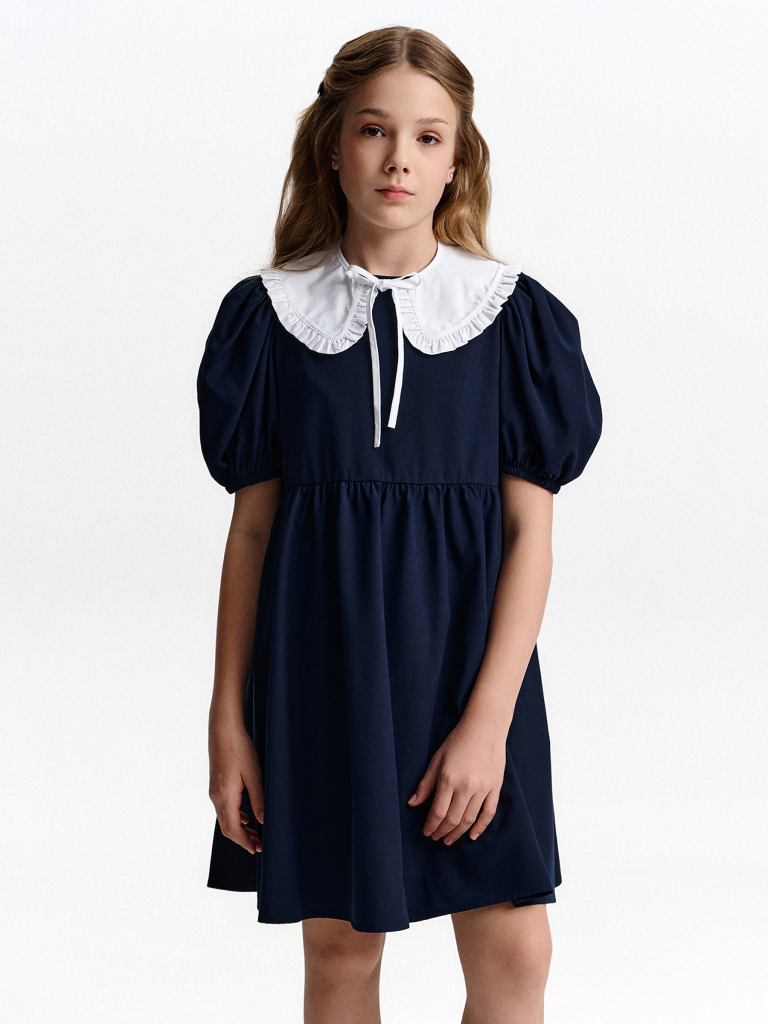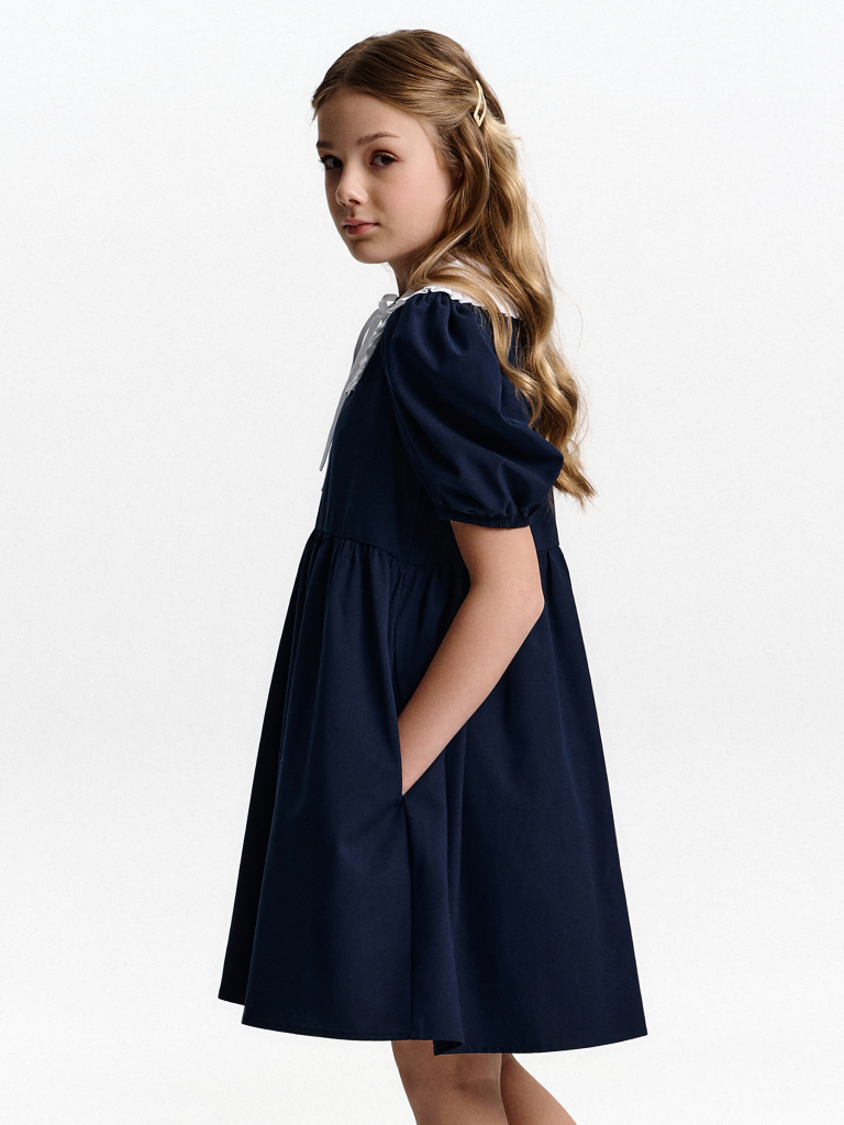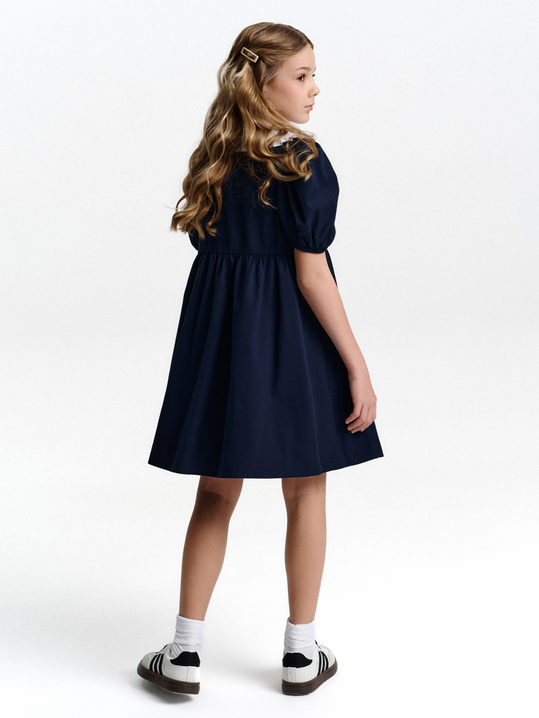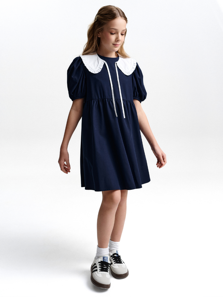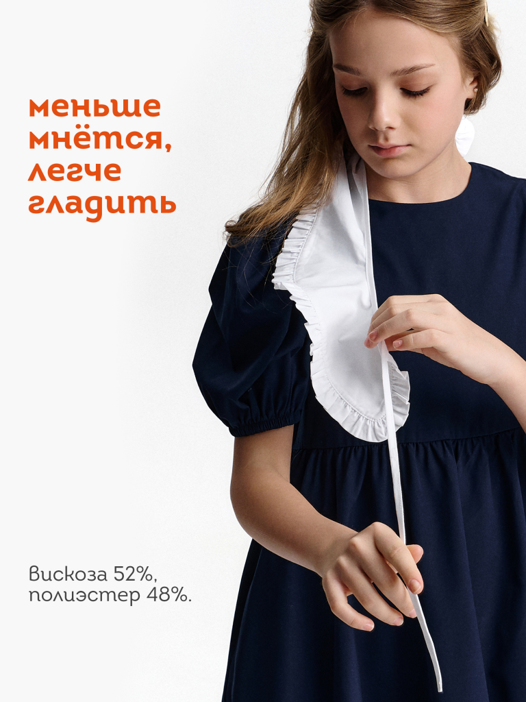 Школьное платье в стиле беби-долл — удобно на учёбу, красиво на каждый день. Свободный силуэт, комфортная посадка и практичные детали — ребёнку будет удобно с утра до вечера, а образ останется аккуратным и стильным. Это платье с завышенной линией талии, свободной юбкой и объёмными рукавами. Ничего не сковывает, ничего не давит — отлично подходит для школы: удобно сидеть, двигаться, писать, носить в жару и с колготками в прохладу. Смесовая ткань — практичный выбор: не мнётся, легко стирается, не требует глажки. Рукава-фонарики с мягкой резинкой — подойдут на любую руку, не сдавливают. Юбка с объёмной сборкой и карманами — красиво и удобно. Застёжка на пуговицу — самостоятельно надевать просто. Съёмный воротник из контрастной ткани — два образа в одном: со школой — нарядно и по форме, без воротника — можно носить как повседневное платье после уроков или в выходные. Рюша по краю воротника добавляет мягкости и делает образ более выразительным. Выбирайте нужный размер по таблице размеров на фото. Цвет товара на экране вашего устройства может отличаться от цвета изделия вживую.