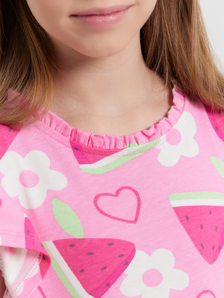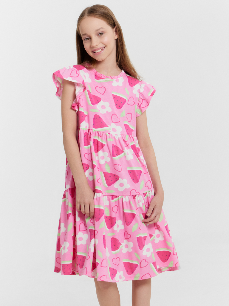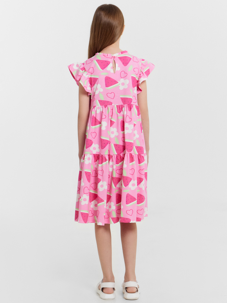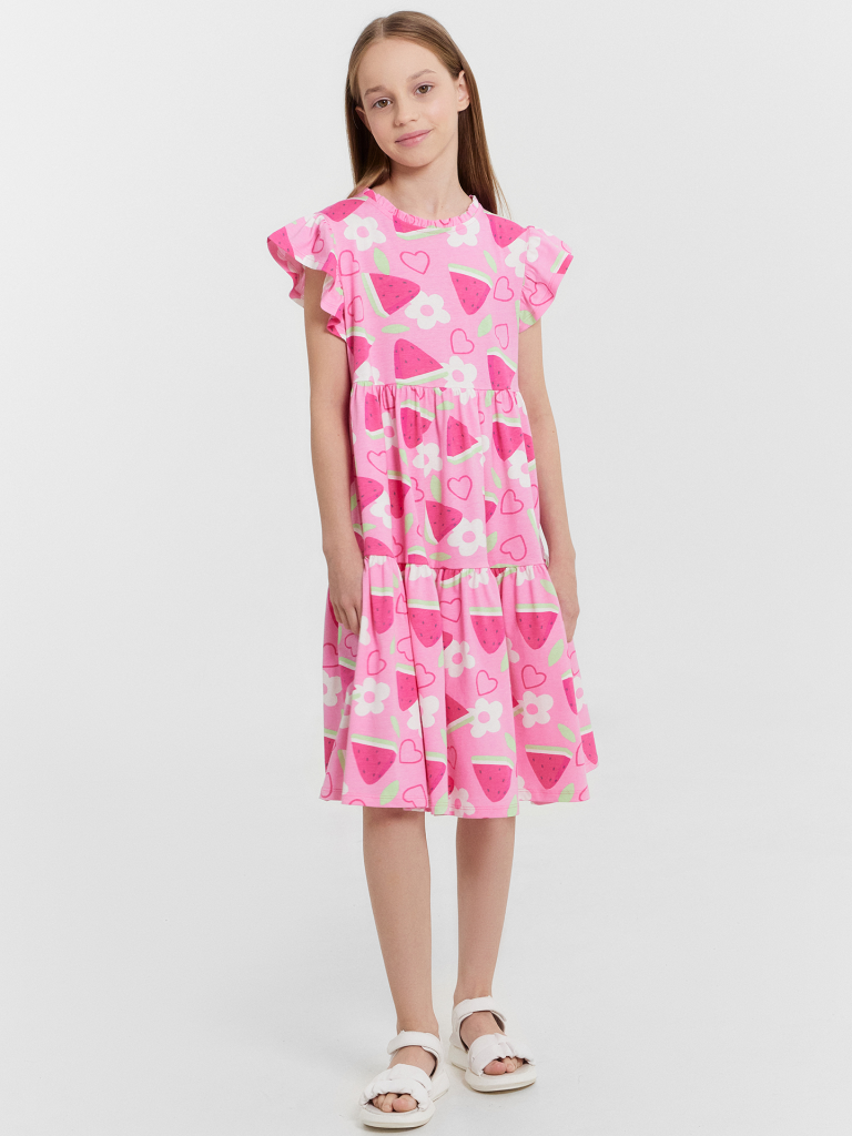 Платье А-силуэта. Короткие рукава-крылышки. В круглую горловину втачана декоративная рюша. По спинке застежка на пуговицу. Платье с двумя отрезными воланами по переду и спинке. Низ изделия обработан швом в подгибку на 2-х игольной плоскошовной машине.