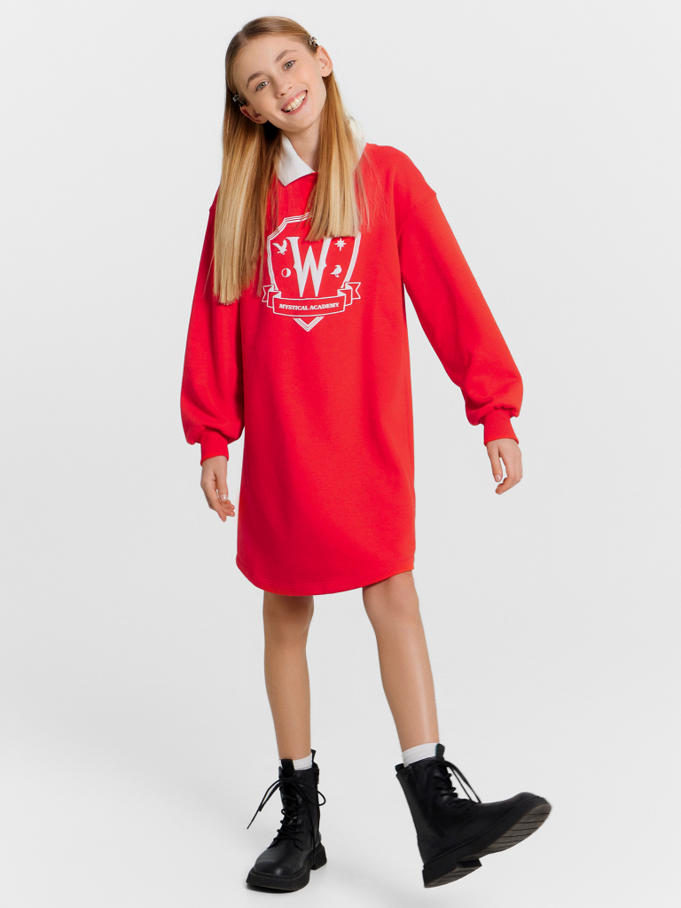 Платье свободного силуэта. Перед и спинка цельнокроеные. Горловина круглой формы c окантовкой из трикотажного полотна рибаны. В горловину втачан вязаный воротник, шов втачивания закрыт х/б тесьмой. Рукава длинные, втачные. Линия плеча спущена. По низу рукавов притачные манжеты из трикотажного полотна рибаны. Низ изделия фигурный, обработан на 2-х игольной