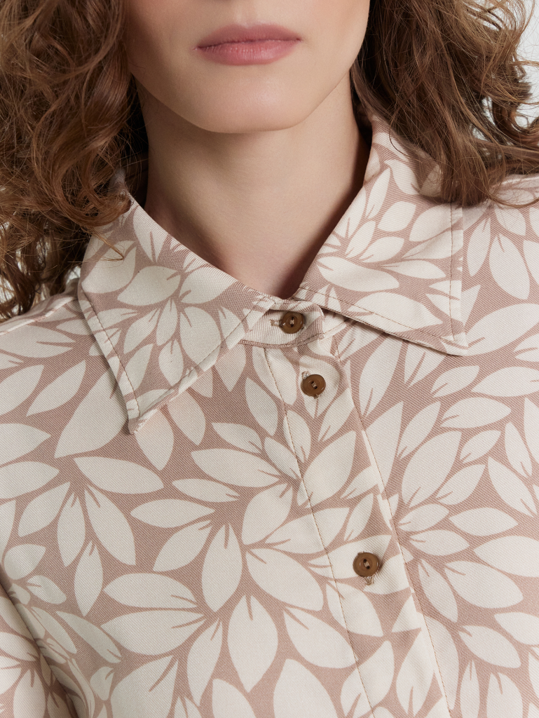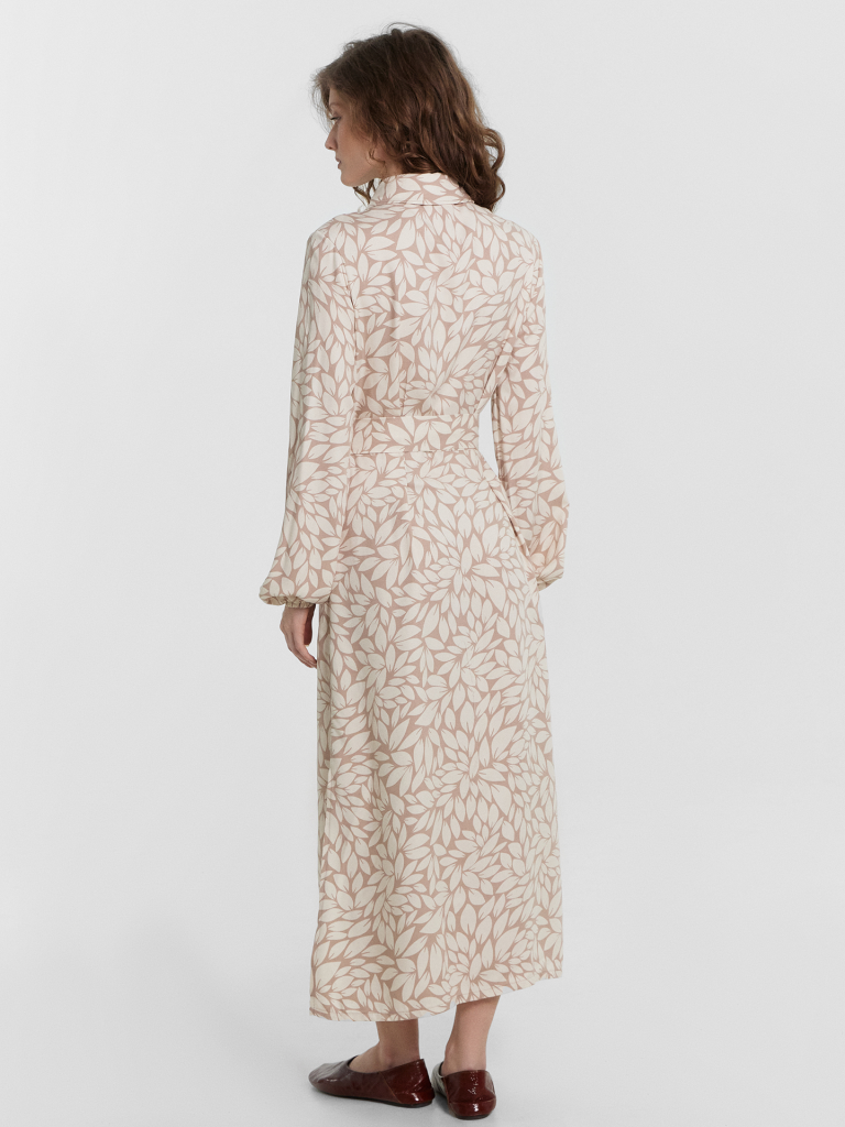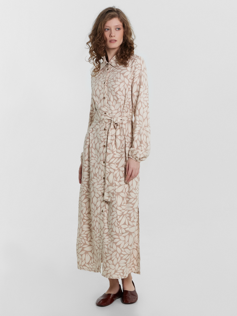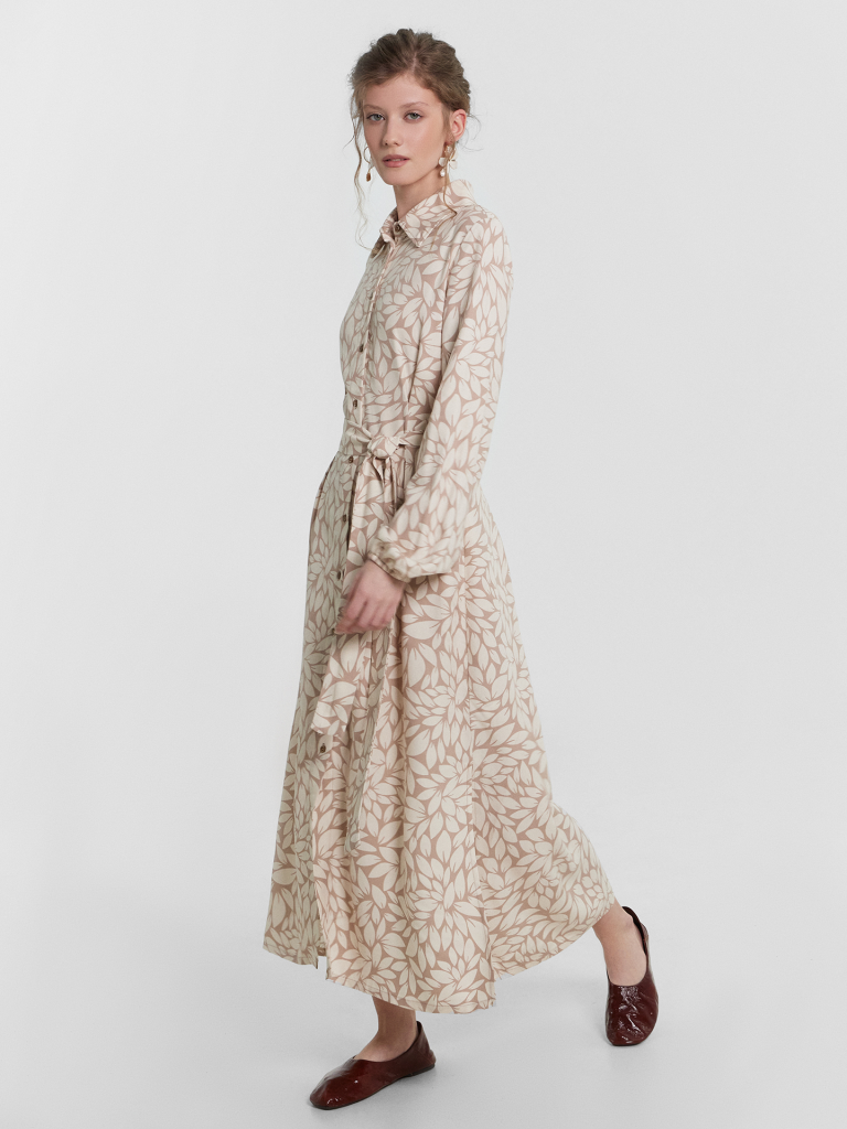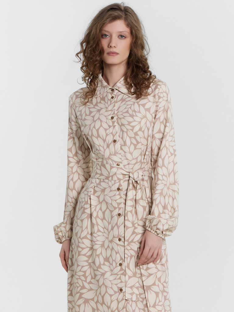 Платье с широким поясом прямого силуэта из ткани. Горловина кргулой формы с втачаным воротником. По переду центральная застежка на пуговицы. На деталях переда и спинки вытачка заложена в одностороннюю складку. Рукав втачной, длинный, по низу подгибка с эластичной тесьмой внутри, образует сборку. В боковых швах обработаны разрезы. Платье длиной ниже колена.