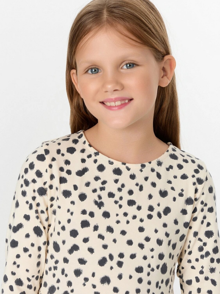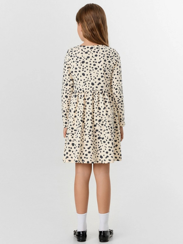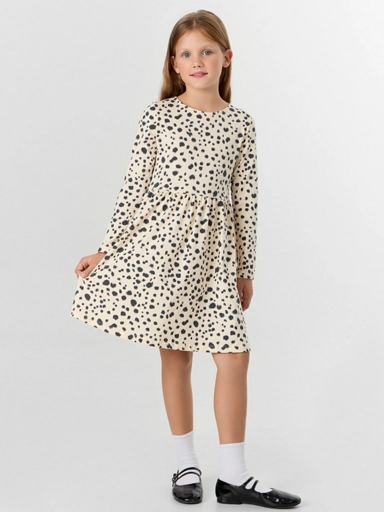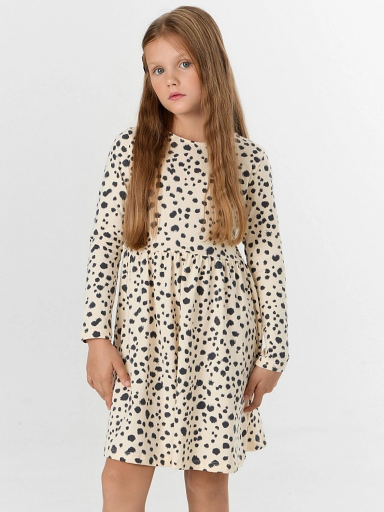 Нарядное платье для девочек, выполненное из хлопковой трикотажной кулирки. Модель платья с отрезной юбкой, в сборочку. Вырез классический – округлый, не глубокий, с окантовкой из кулирки. Рукав длинные, свободные. Рекомендуем для праздников и утренников!