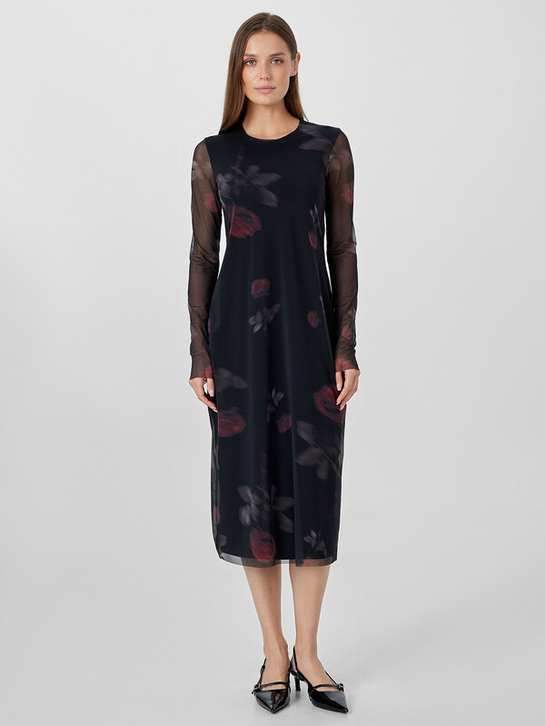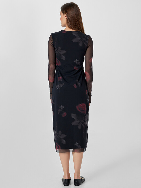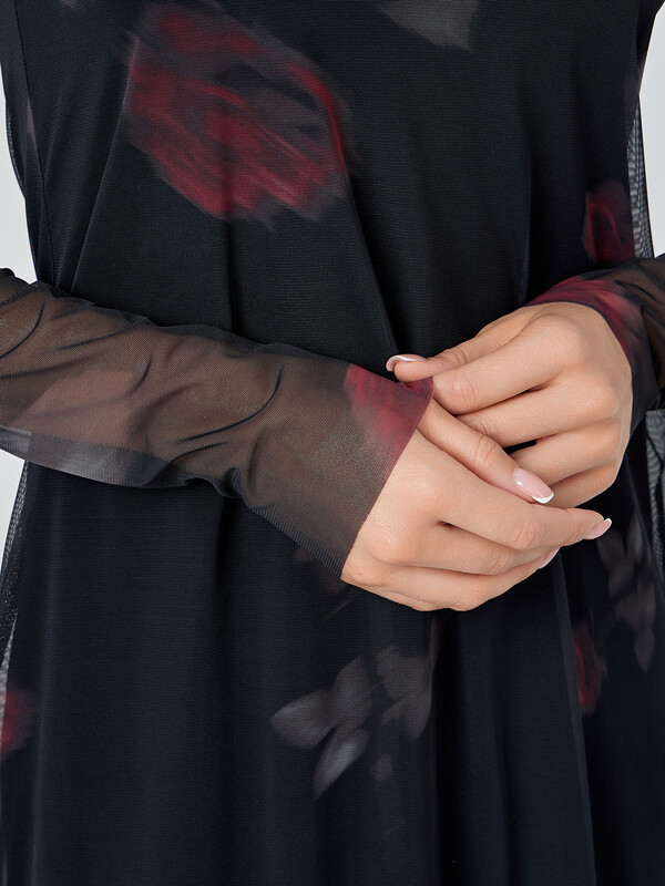 Черное платье с изящным узором роз — воплощение элегантности и комфорта. Модель полуприлегающего силуэта мягко подчеркивает фигуру, плавно расширяясь к низу. Длина ниже колена и длинные рукава создают сдержанный образ для разных случаев.