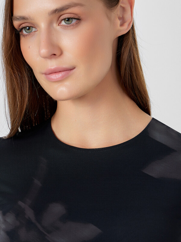 Основная ткань — воздушная сетка с эластаном, сохраняющая форму и обеспечивающая легкую воздухопроницаемость. Внутренняя подкладка из смеси модала и хлопка с добавлением эластана дарит коже приятную прохладу и нежность. Круглая горловина с аккуратной обработкой и эффект необработанного среза низа с рукавами добавляют современности.