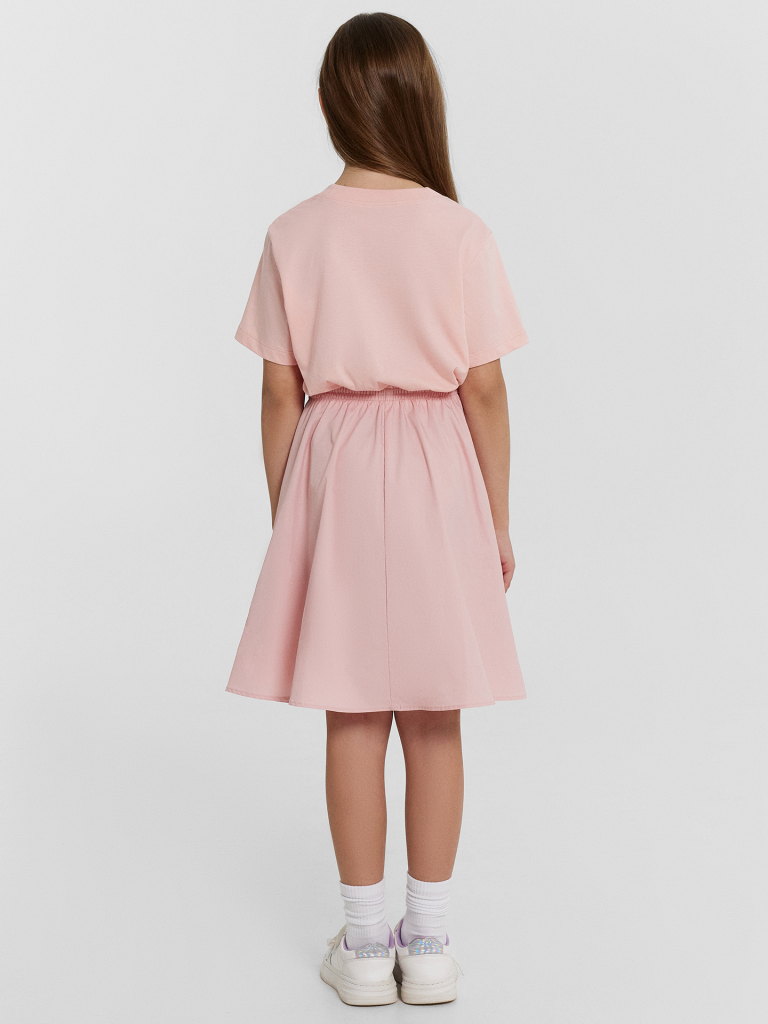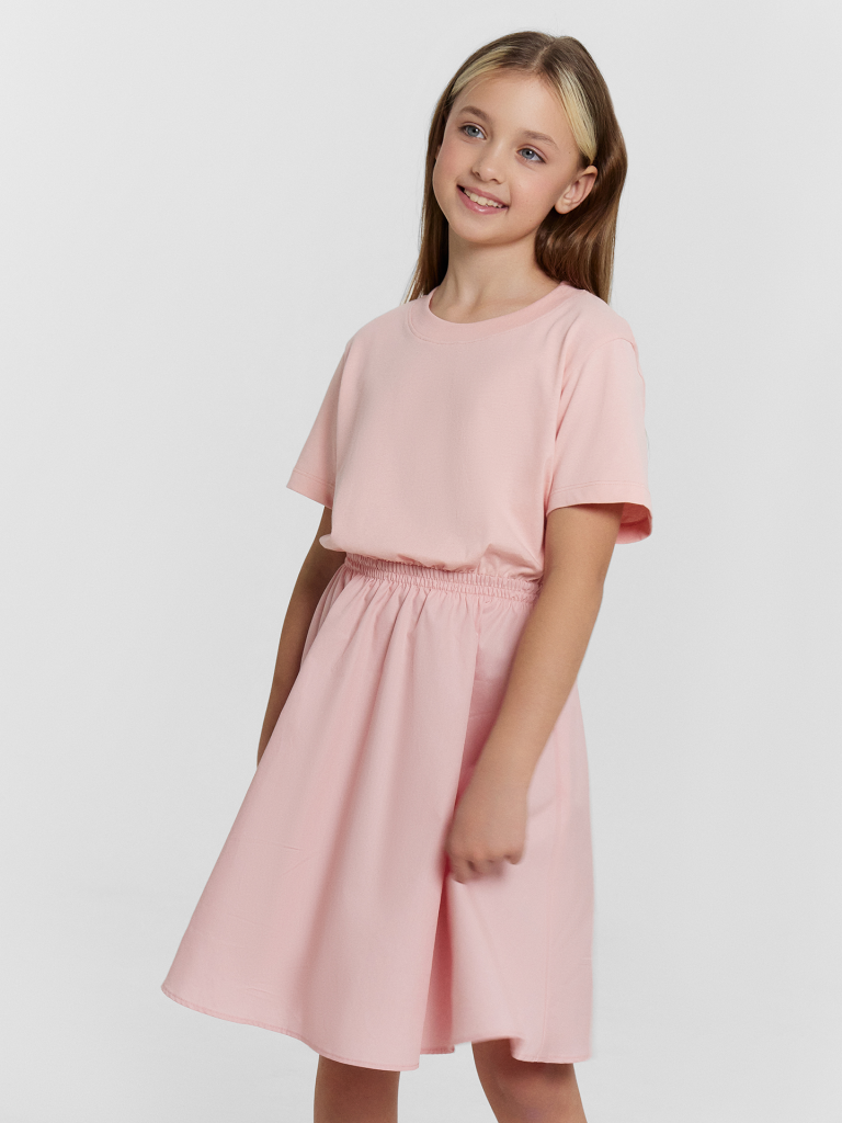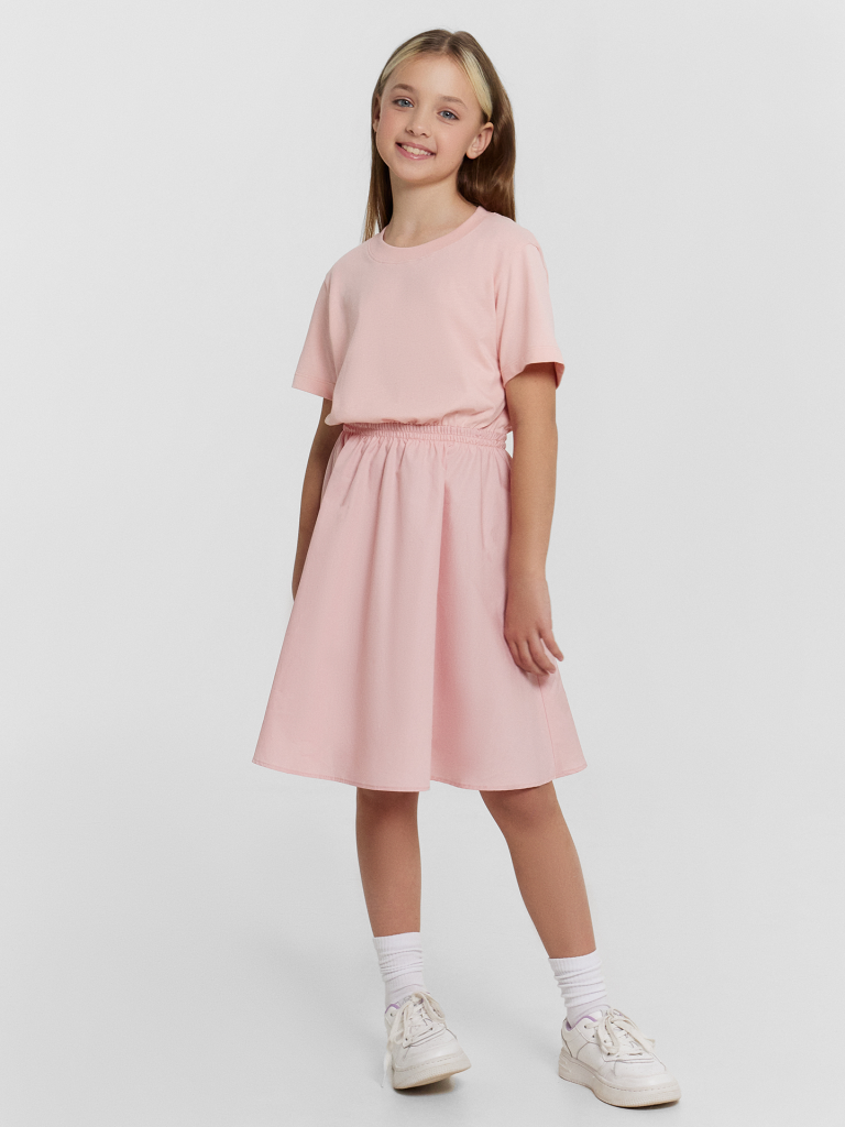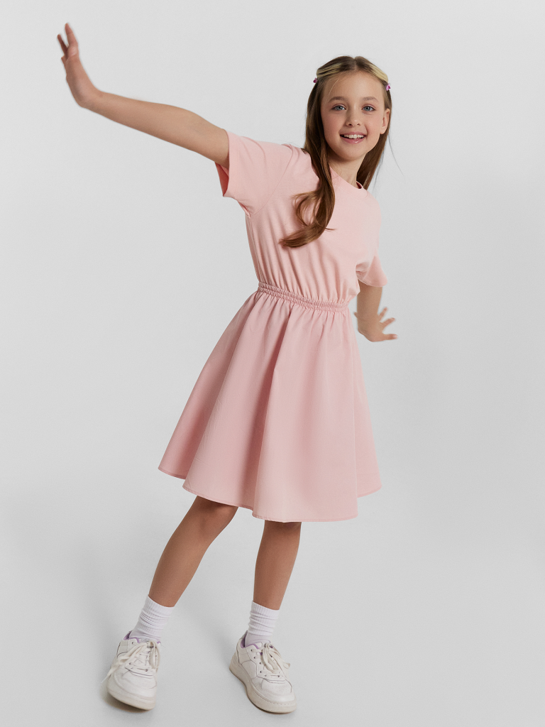 Нежное платье для девочек полуприлегающего силуэта — это сочетание комфорта, практичности и утонченного дизайна. Верх модели из кулирки обеспечивает мягкость и удобство, а низ из поплина добавляет легкости, создавая гармоничный ансамбль материалов. Круглая горловина, окантованная обтачкой из рибаны, выглядит аккуратно и обеспечивает комфортную посадку. Короткие рукава делают платье подходящим для теплой погоды, а эластичная сборка на талии добавляет изящества, подчеркивая силуэт. Длина ниже колена делает эту модель универсальной и подходящей для повседневной носки, сочетая элегантность с удобством. Такое платье станет отличным выбором для маленьких модниц, добавляя нежности и очарования в их гардероб. Рекомендуем!
