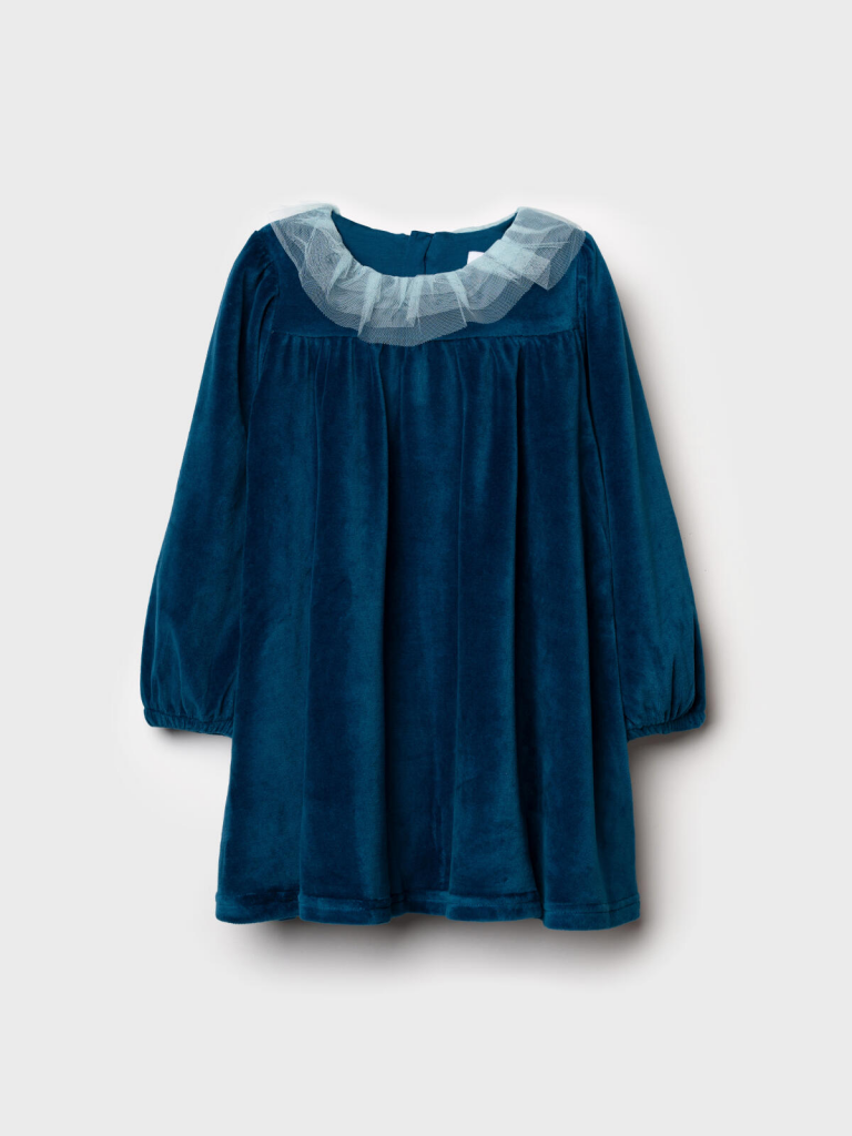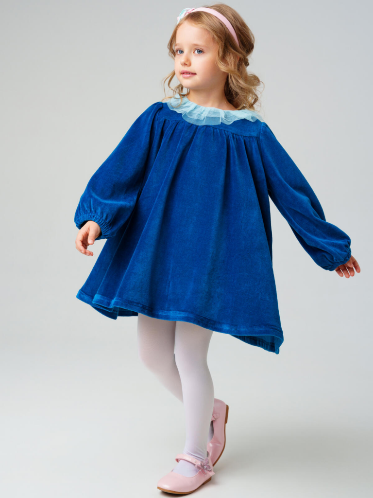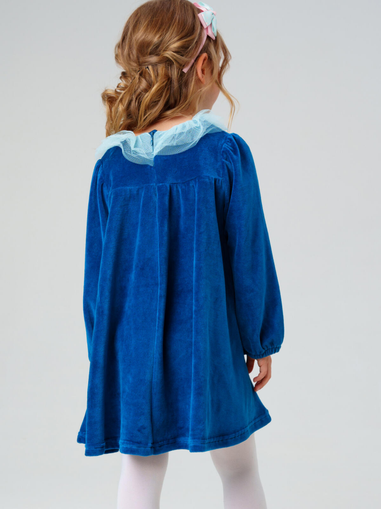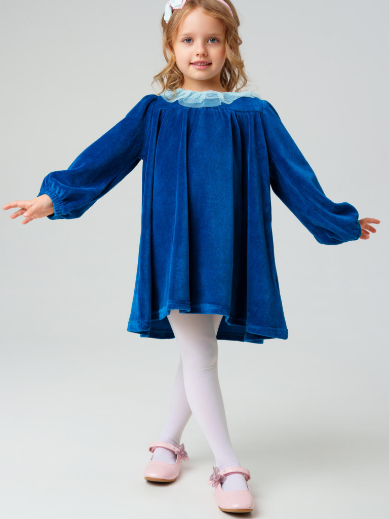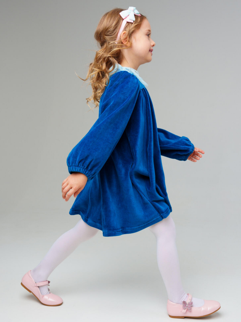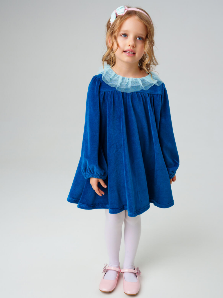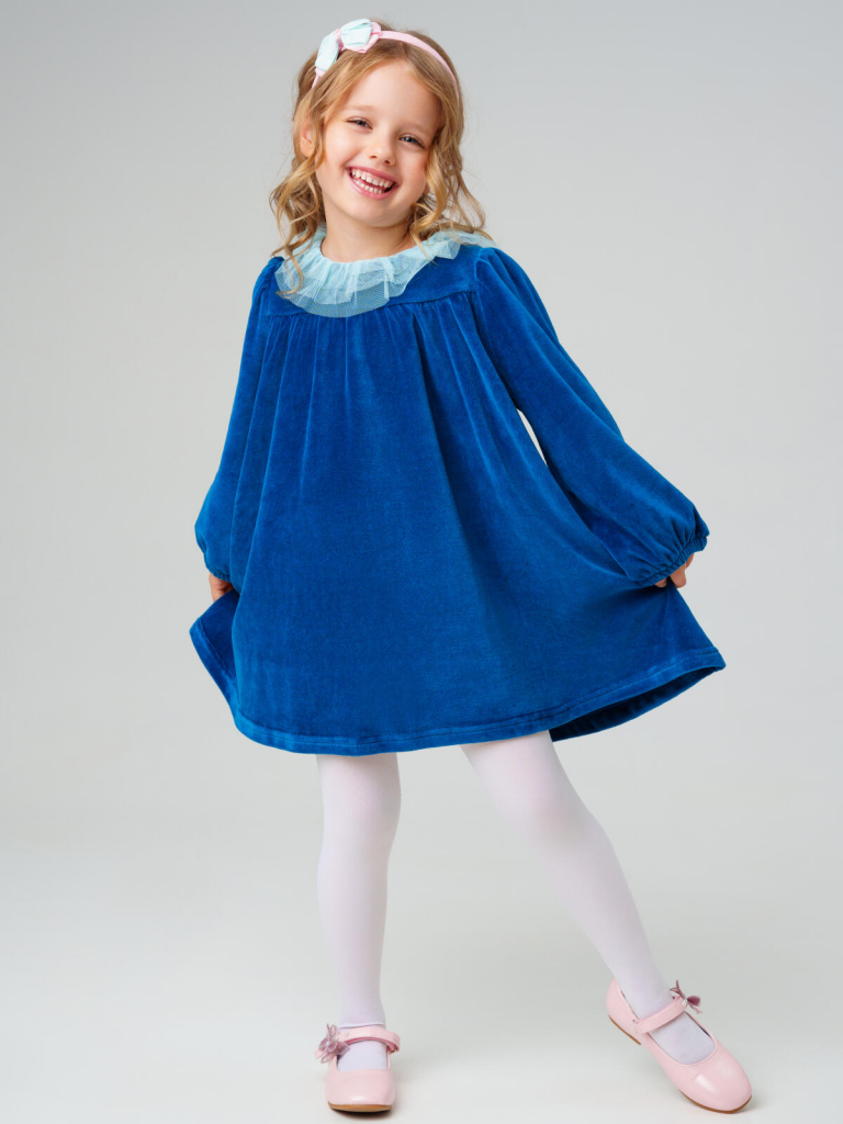 Нарядное детское платье для девочки от PlayToday — уютная и стильная модель из мягкого велюра с акцентом на воротнике из многослойного фатина. Такое платье идеально подойдёт для праздников, фотосессий и особых случаев, сочетая комфорт с эффектным дизайном.Преимущества модели:+ материал верха — велюр плотностью 250 г/м2: мягкий, тёплый и приятный к телу+ воздушный воротник из фатина — нежный декоративный акцент, создающий праздничное настроение+ свободный крой — не сковывает движений и комфортен в носке+ длинные рукава на резинке — удобно и практично+ лёгкий блеск ткани добавляет нарядности и элегантностиКогда и как носить:Платье подходит для праздников, утренников, театральных походов, фотосессий и семейных торжеств. Также можно носить в повседневных образах — достаточно добавить плотные колготки и стильную обувь.Советы по стилю:Сочетайте с балетками, ботинками или сапожками от PlayToday. В прохладное время года дополняйте жакетом, вязаным кардиганом или болеро из коллекции PlayToday.Размерный ряд: Модель рассчитана для девочек 98-122 см.Платье PlayToday из велюра с фатиновым воротником — нежный образ для маленькой модницы, где сочетаются комфорт, стиль и праздничное настроение.