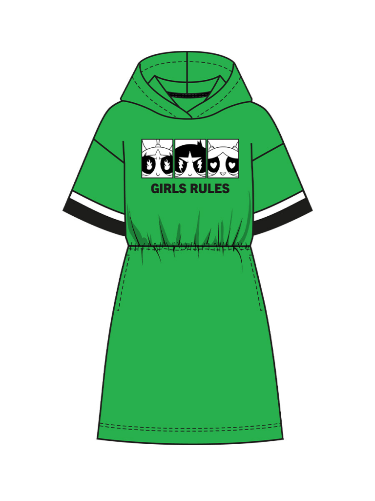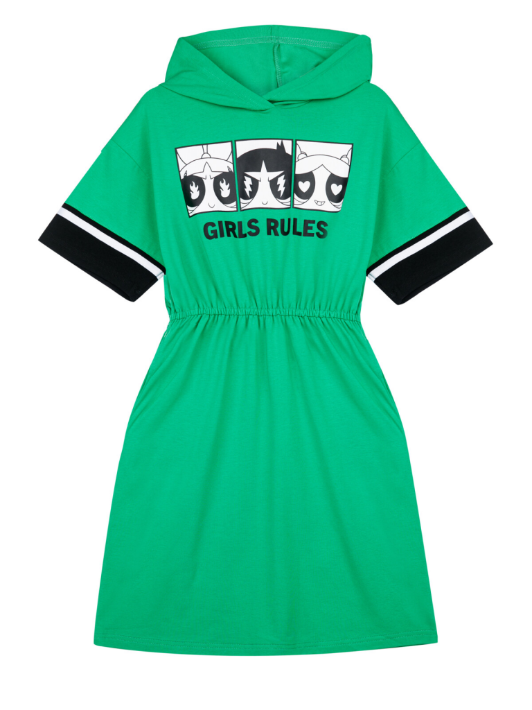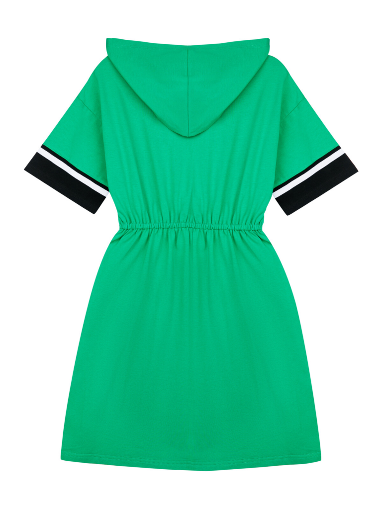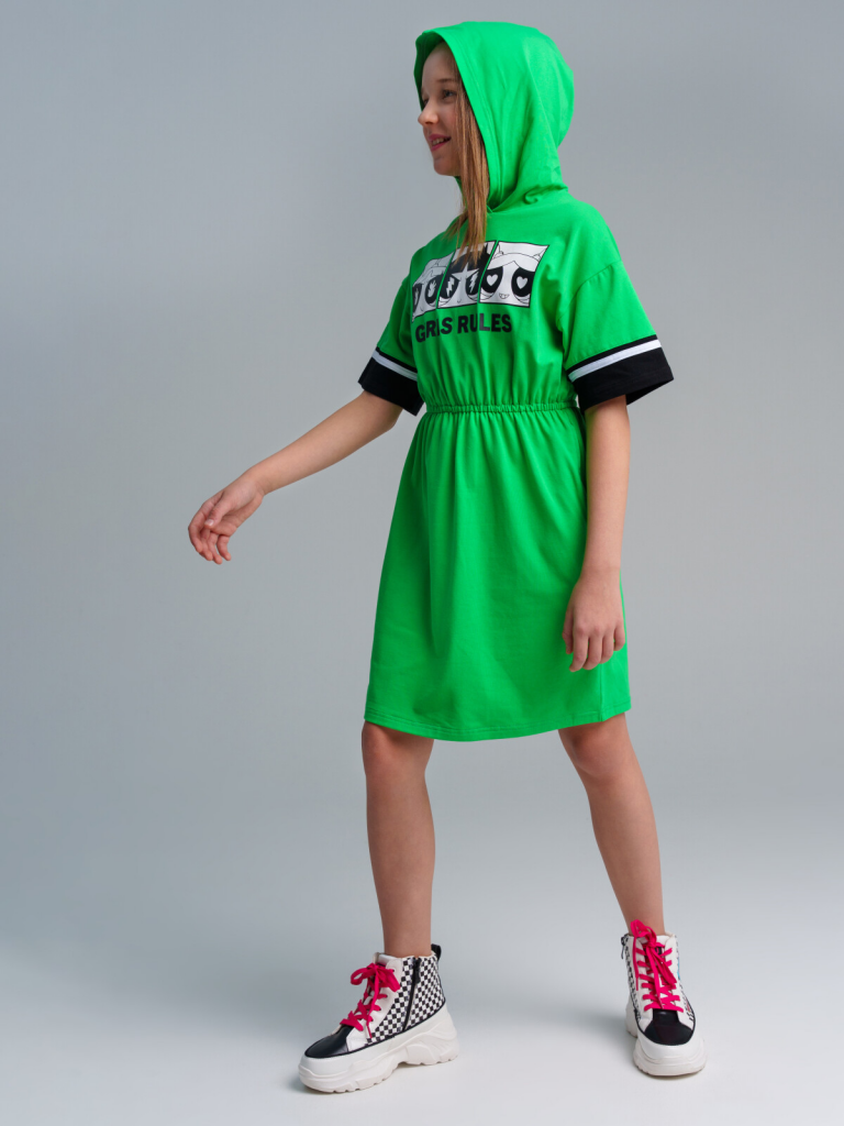 Платье с капюшоном из качественного и приятного на ощупь трикотажа джерси. Высокое содержание хлопка 95%. Благодаря наличию эластана в составе ткани изделие проще в уходе и держит форму. По талии эластичная резинка.