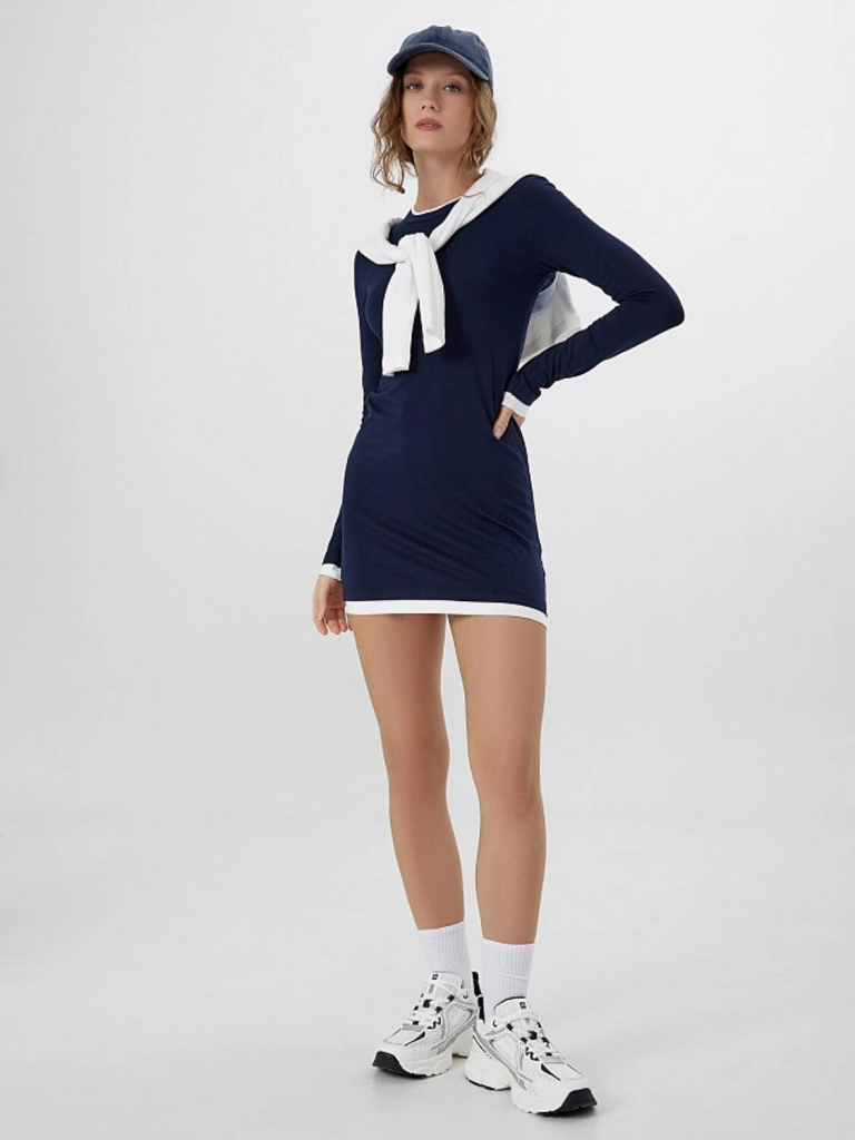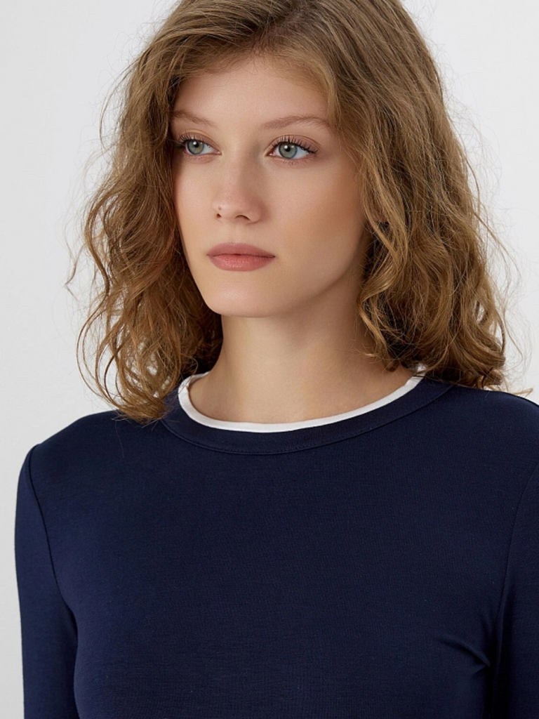 Модель прилегающего силуэта мягко подчеркивает фигуру, сохраняя свободу движений. Глубокий оттенок добавляет образу благородства, а круглая горловина с имитацией двойной обтачки и длинные рукава создают завершенный силуэт. Дизайн дополнен оригинальной деталью по низу платья и рукавов — имитацией поддетого платья, что придает модели стильную многослойность.