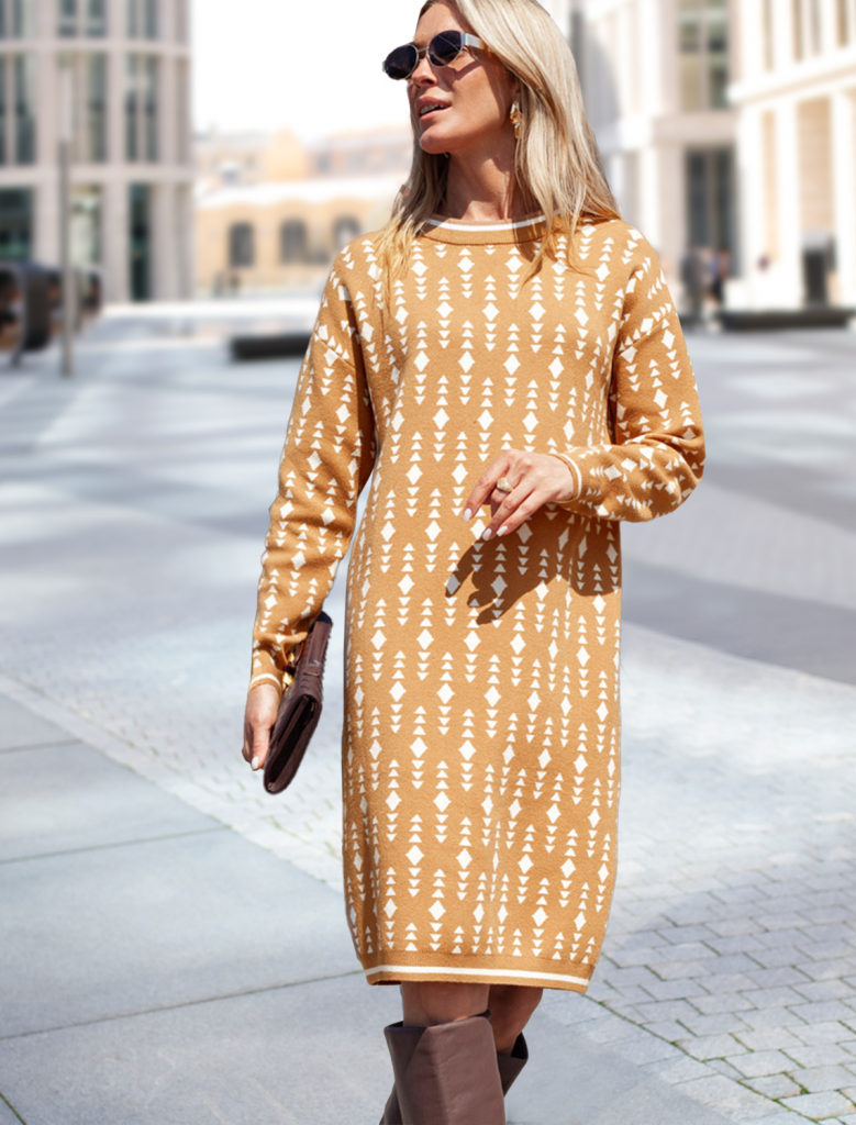 Платье жаккардовой вязки выполнено из мягкой пряжи на основе вискозы с добавлением кашемира. Модель свободного силуэта подходит для любой фигуры. Нежная пряжа очень комфортно ощущается на теле, сохраняя оптимальное тепло при этом не перегревая. Совет стилиста: жаккардовое платье отличная инвестиция в базовый гардероб, которая поможет создать дорогие образы. Носите с высокими сапогами удлиняя силуэт или плотными колготками.