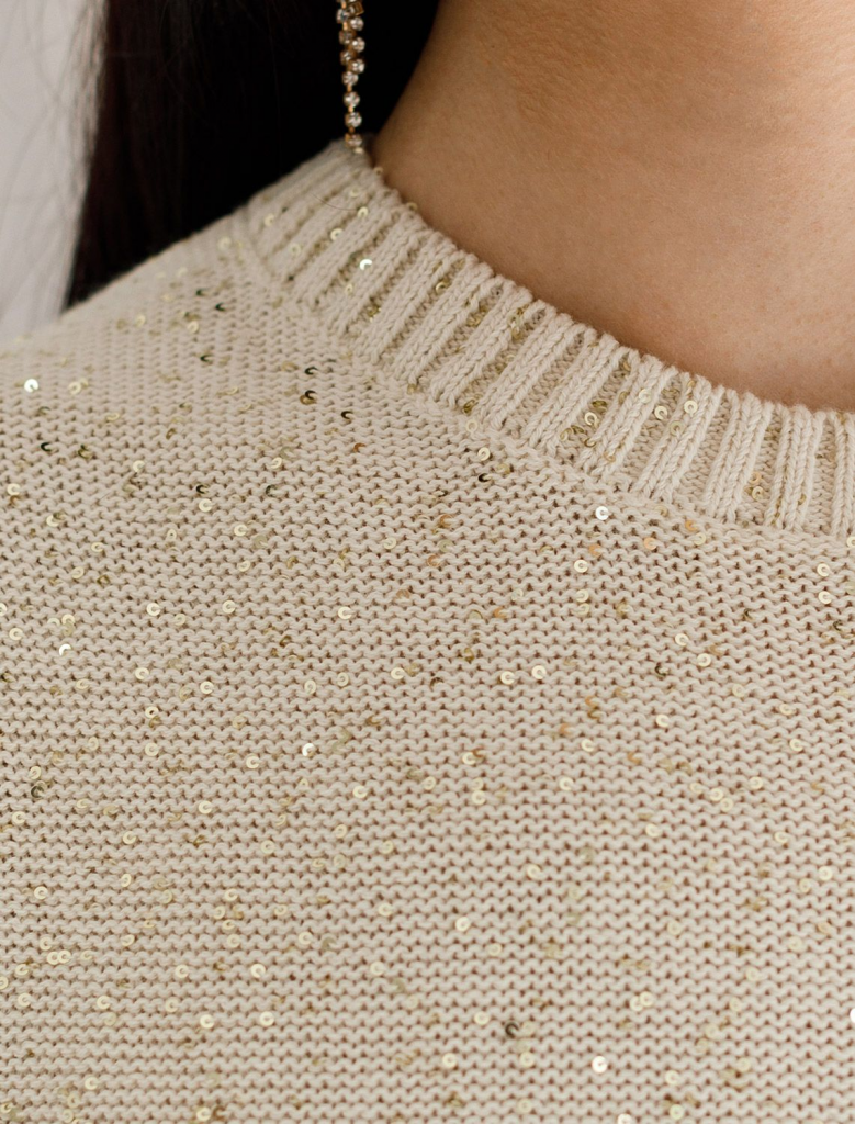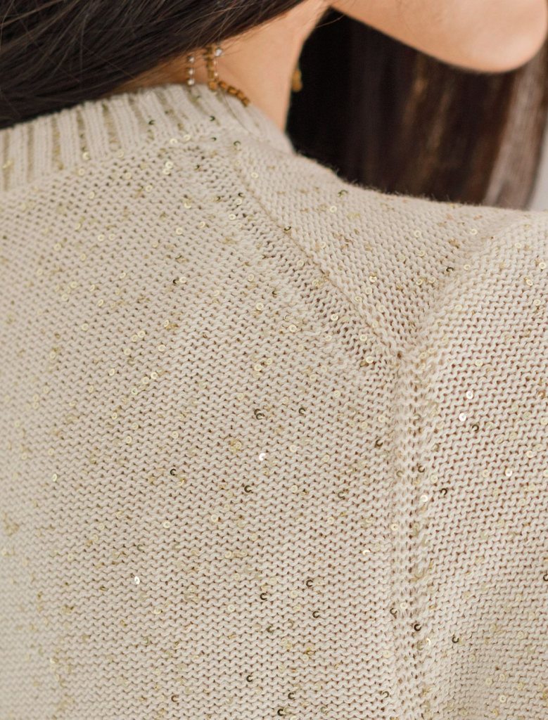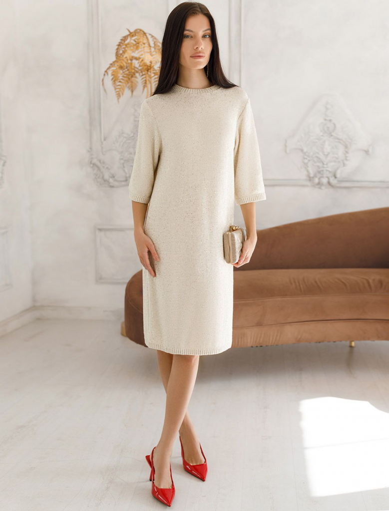 Эффектное платье бежевого цвета с широкими рукавами средней длины выполнено из хлопковой пряжи с вкраплением сияющих пайеток, что придает особую изысканность. Платье связано изнанкой, пряжа отличается легкостью и приятной текстурой, совершенно не колется, обеспечивает комфорт даже при длительном использовании, а натуральные волокна поддерживают оптимальный температурный баланс. Крой полуприлегающий, подчеркивает женственный силуэт, а круглый ворот, манжеты на рукавах и по низу гармонично завершают дизайн, создающий аккуратный образ. Благодаря универсальному крою, платье подойдет девушкам и женщинам пышных форм и больших размеров, длина миди подходит на низкий и высокий рост. Мерцающее полотно добавляет особого шарма вашему образу, делая его уместным как на праздник, так и для повседневного выхода. Новый год, вечеринка или любое другое мероприятие пройдут ярко — сияющие пайетки создают ощущение праздника в каждом движении. Это стильное платье поможет чувствовать себя уверенно на любом мероприятии в осенний и