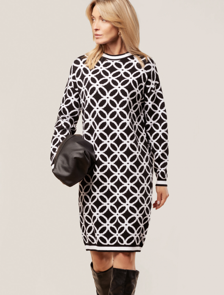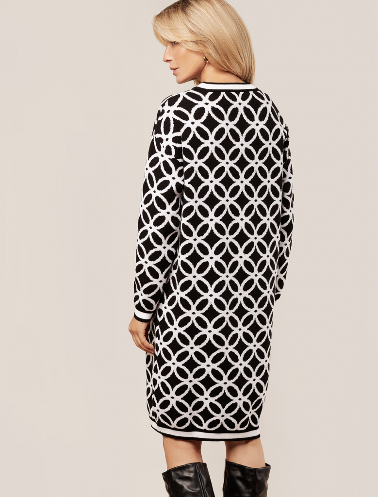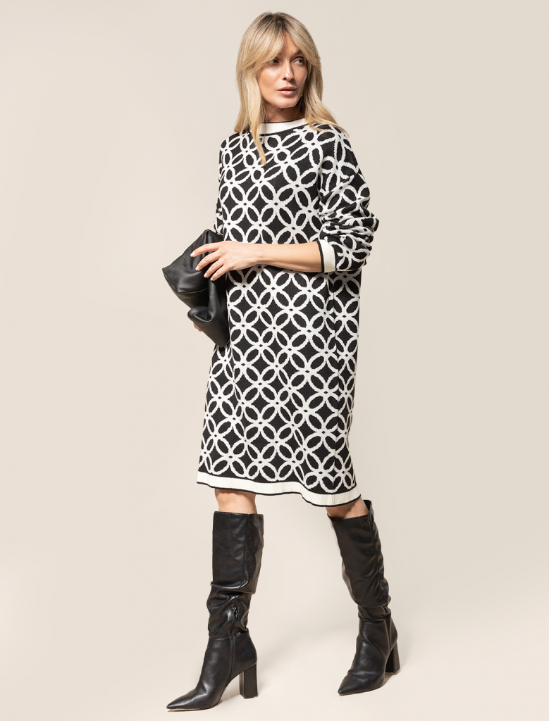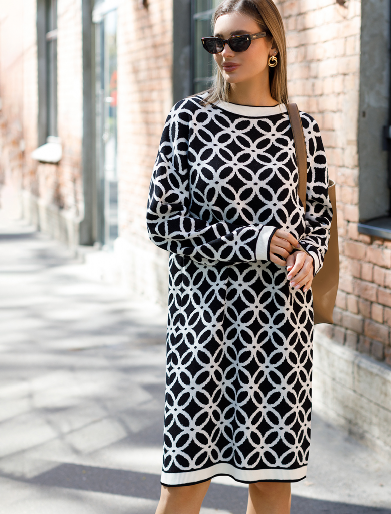 Платье жаккардовой вязки выполнено из мягкой пряжи на основе вискозы с добавлением кашемира. Модель свободного силуэта подходит для любой фигуры. Нежная пряжа очень комфортно ощущается на теле, сохраняя оптимальное тепло при этом не перегревая. Совет стилиста: жаккардовое платье отличная инвестиция в базовый гардероб, которая поможет создать дорогие образы. Носите с высокими сапогами удлиняя силуэт или плотными колготками.
