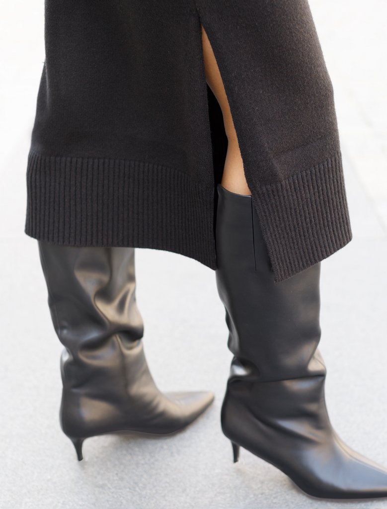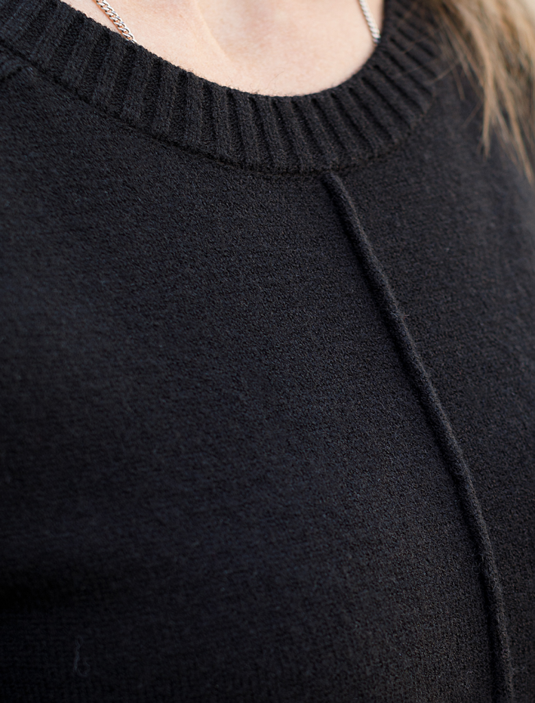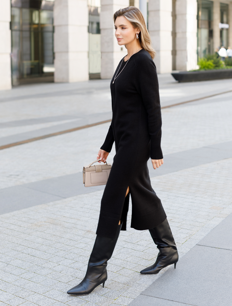 Платье длины миди выполнено из мягкой меланжевой пряжи с кашемиром. Модель прямого силуэта дополнена одиночным высоким боковым разрезом. Вязаный кант вертикально проходящий по всему изделию, визуально стройнит и вытягивает силуэт. При желании можно подчеркнуть линию талии, используя контрастный пояс.