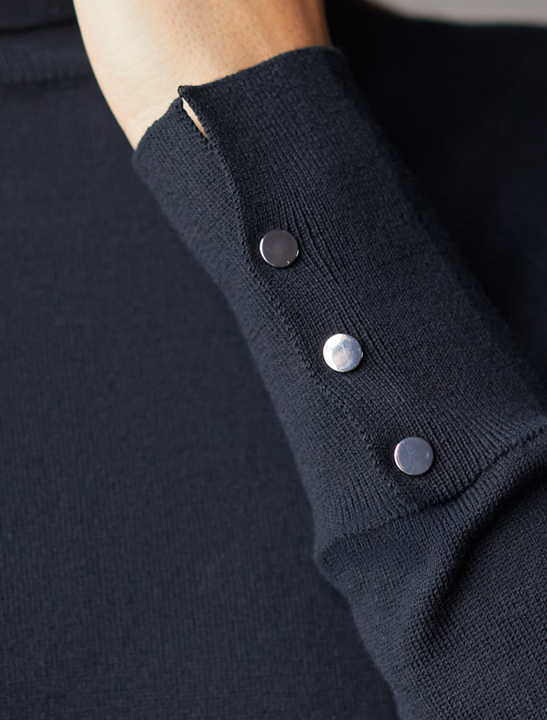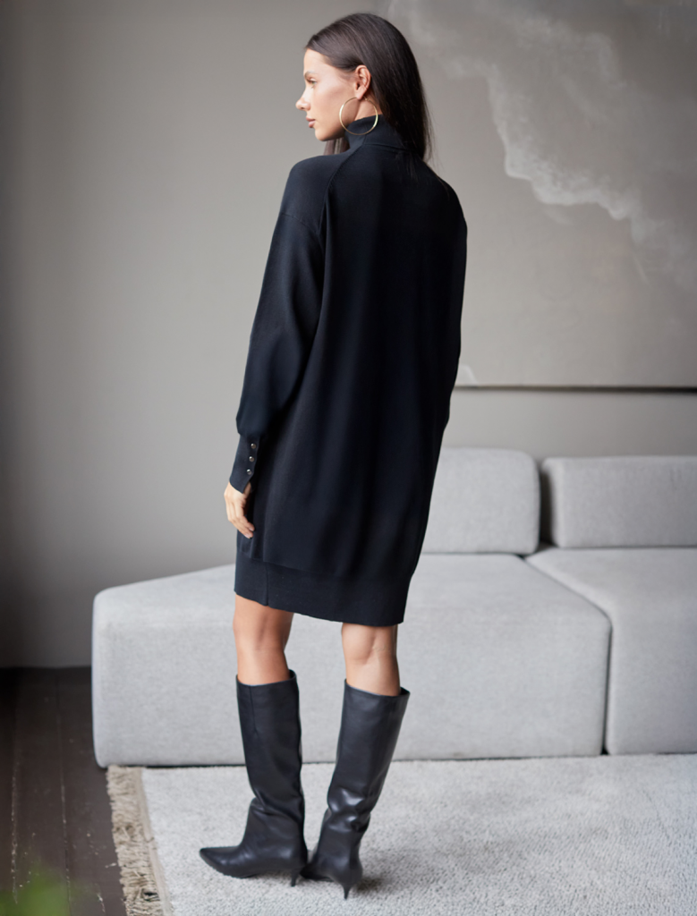 Платье тонкой вязки выполнено из хлопка. Лаконичная модель с высоким воротом как у водолазки дополнена манжетами с золотистыми пуговицами. Изделие свободно сидит по фигуре и не сковывает движений. Мягкая пряжа очень приятная к телу не колется и сохраняет тепло при этом не перегревая.