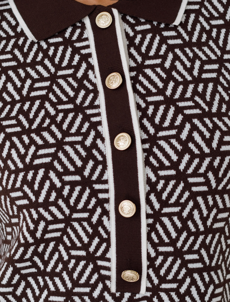 Платье жаккардовой вязки выполнено из нежной пряжи на основе вискозы с добавлением кашемира. Модель прямого силуэта с застежкой планкой как у поло. Фигурные золотистые пуговицы вносят изысканности и роскоши. Изделие приятно ощущается на теле и поддерживает комфортный микроклимат. Сочетается в комплекте total-look с жакетом D31.150