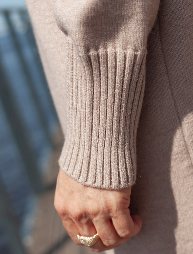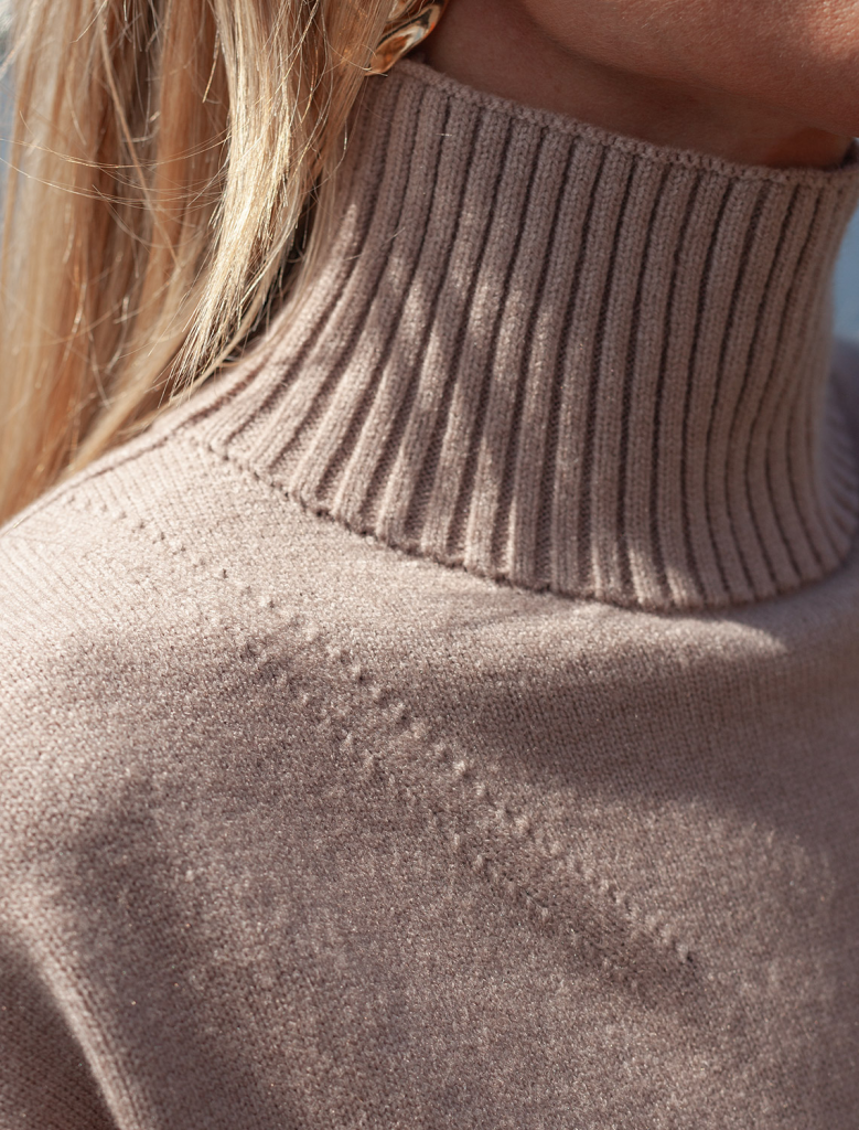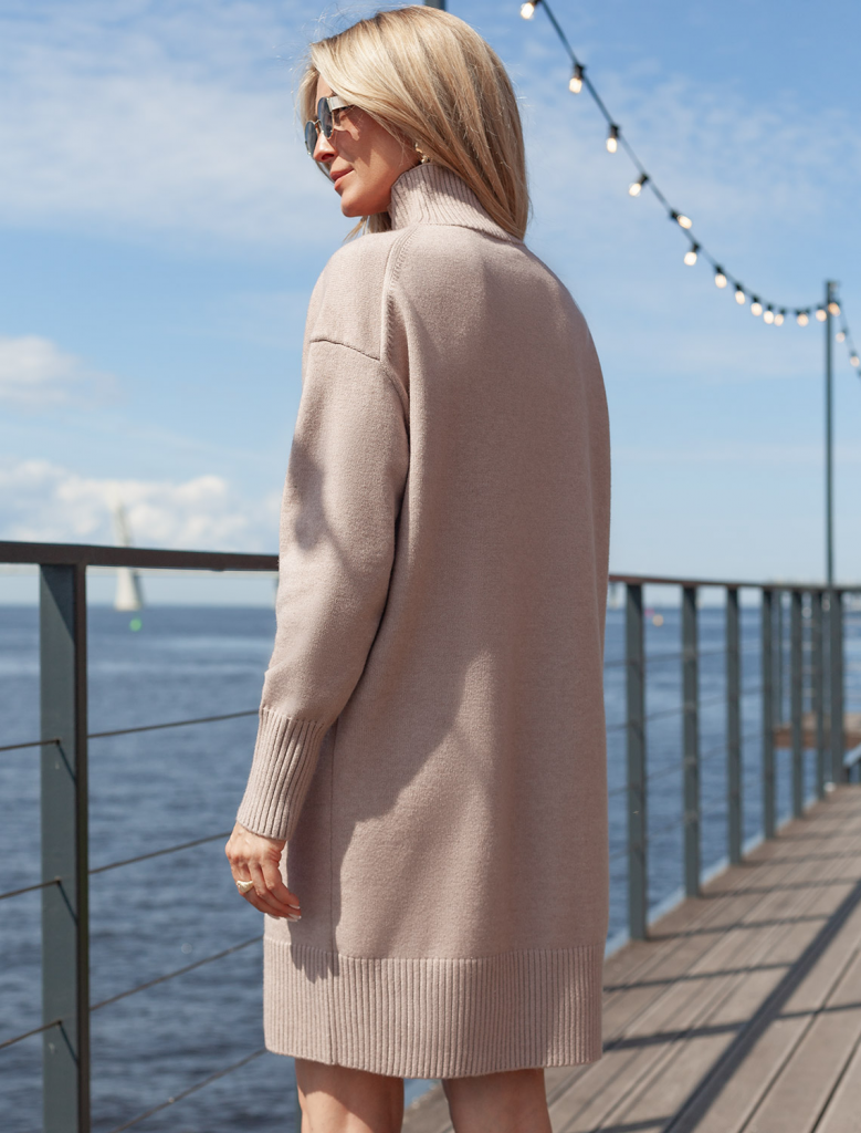 Платье с воротом стойка выполнено из мягкой меланжевой пряжи с кашемиром. Модель свободного силуэта со спущенным плечом хорошо впишется в расслабленные осенне-зимние аутфиты с высокими сапогами. Изделие очень приятное к телу, совершенно не колется и отлично сохраняет тепло при этом не перегревая.