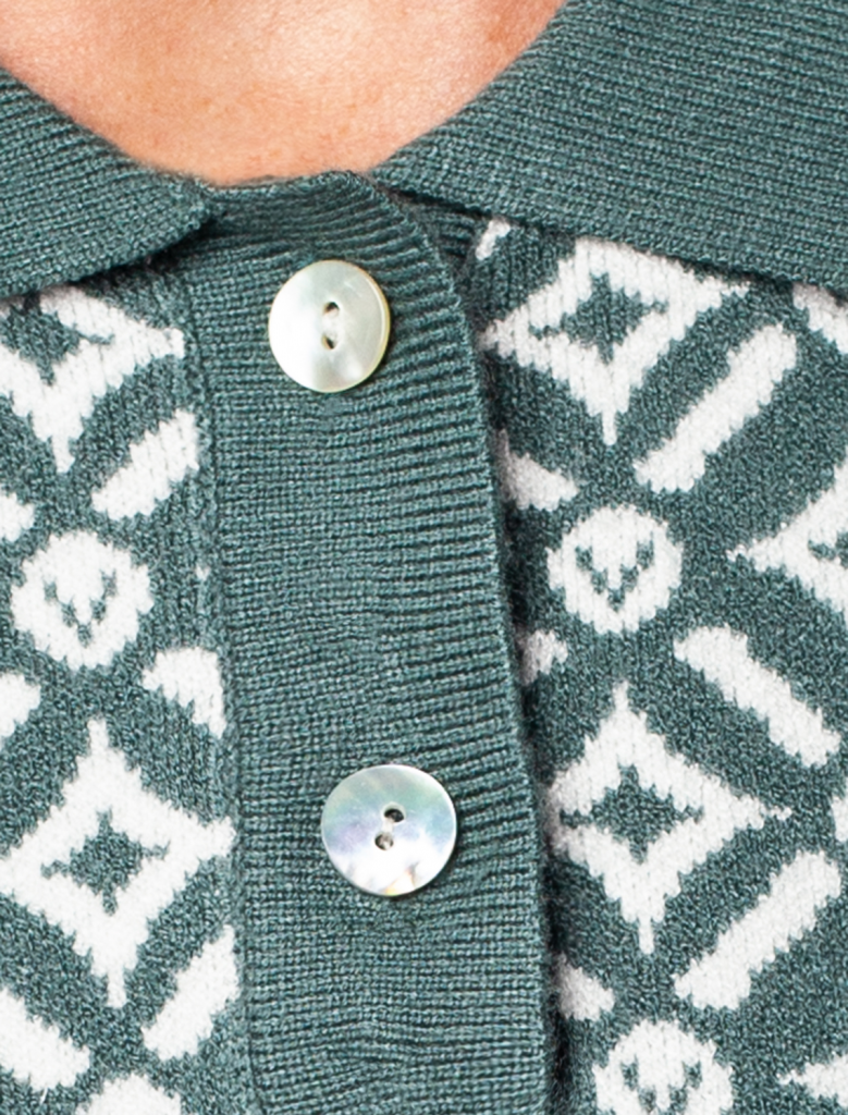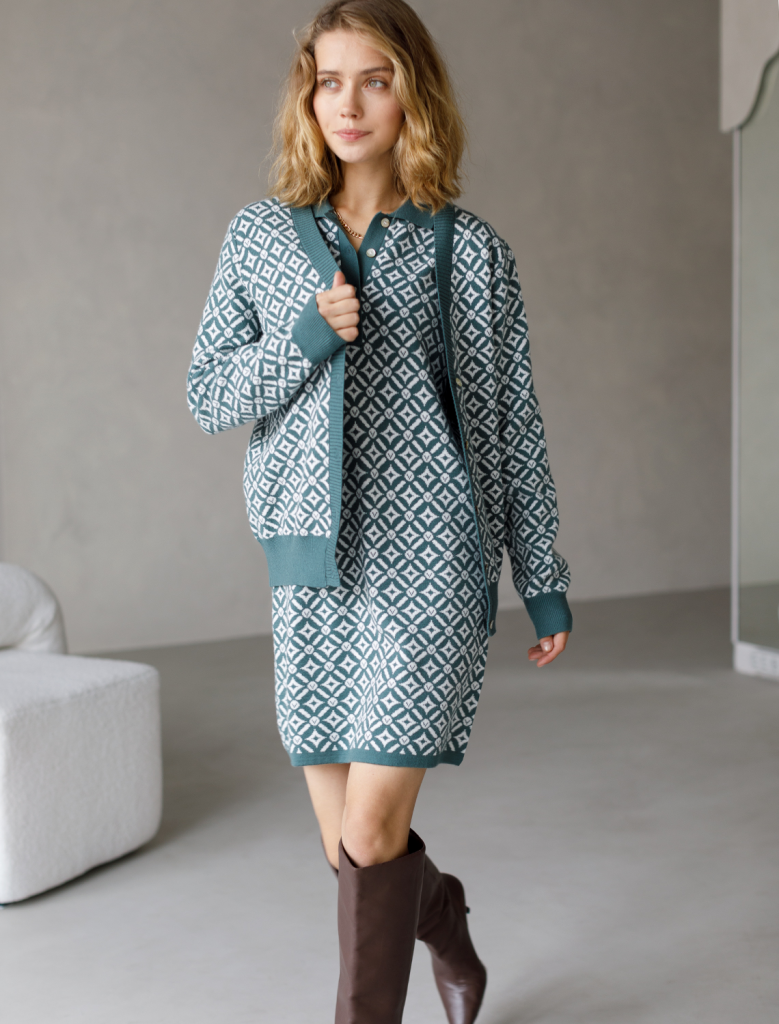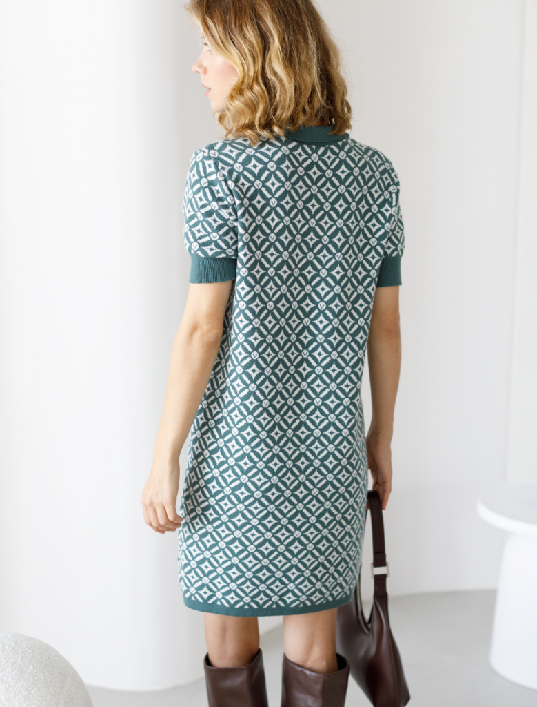 Платье длины мини с воротником поло выполнено из мягкого трикотажа на основе шелковистой эластичной вискозы. Жаккардовое переплетение образует геометрический узор. Застежка на перламутровые пуговицы подчеркивает гладкость пряжи. Контрастный воротник и манжеты делают узор еще более выразительным. Можно сочетать с жакетом D31.388 из жаккардовой коллекции.