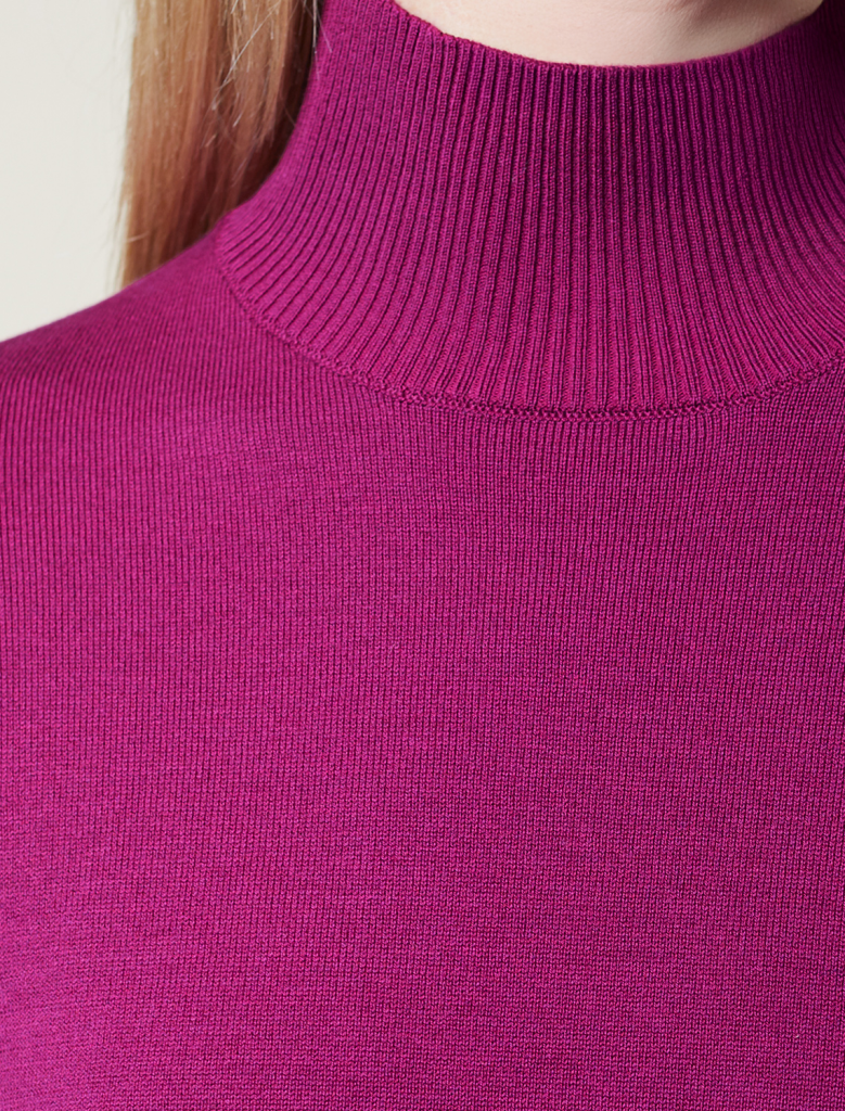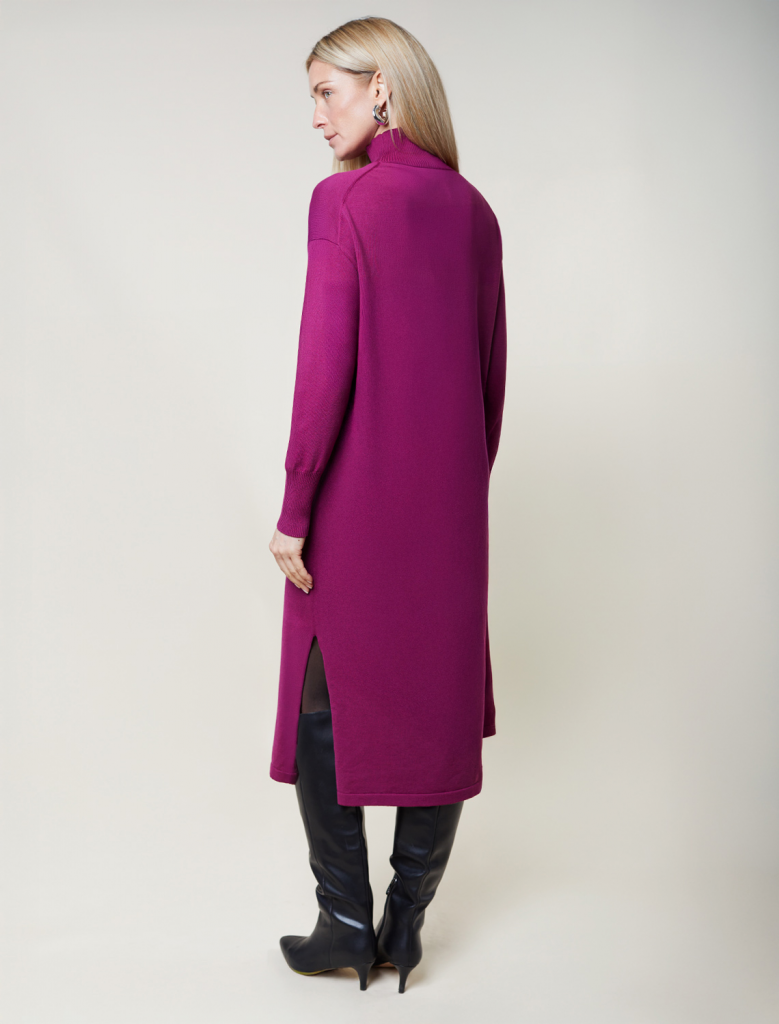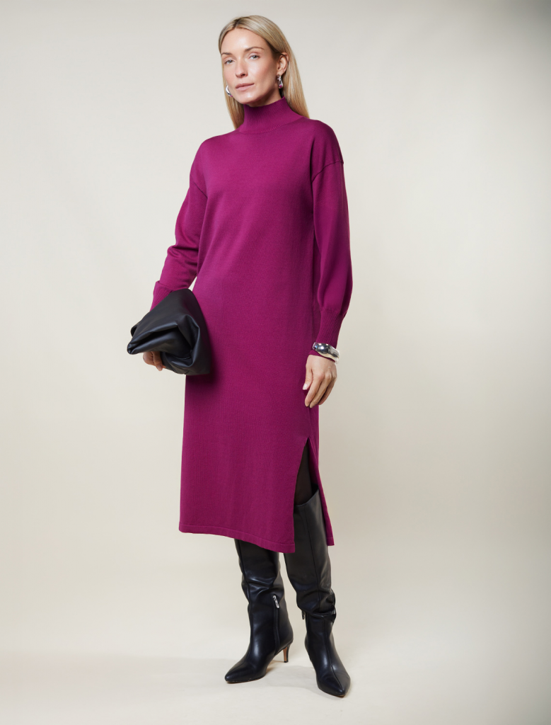 Платье тонкой вязки выполнено из хлопка. Лаконичная модель с высоким воротом дополнена манжетами и разрезами по бокам. Изделие свободно сидит по фигуре и не сковывает движений. Мягкая пряжа очень приятная к телу не колется и сохраняет тепло при этом не перегревая. Изделие дополнено металлическим логотипом бренда.