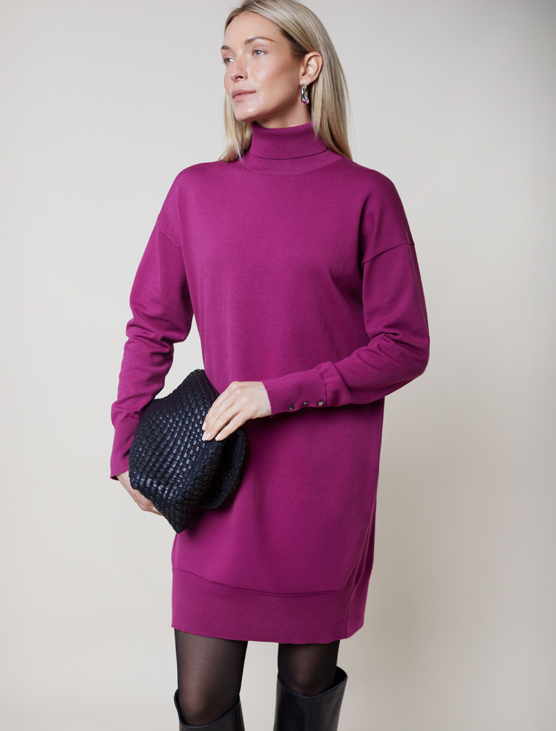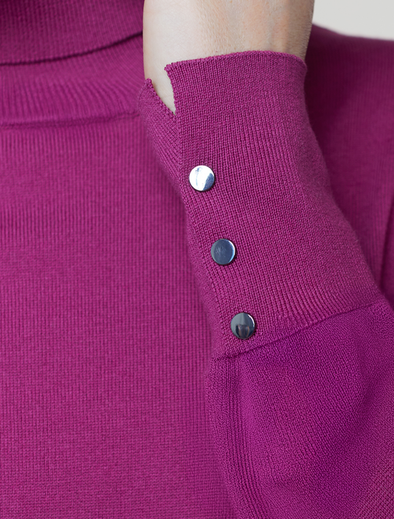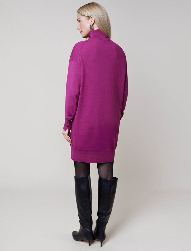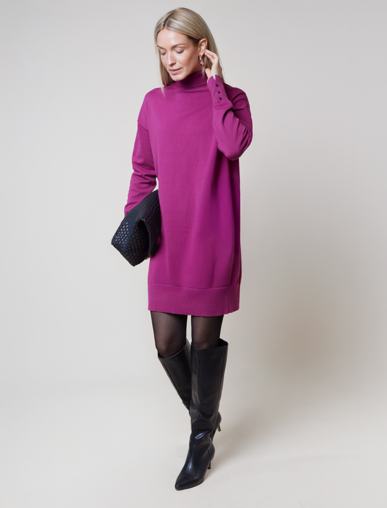 Платье тонкой вязки выполнено из хлопка. Лаконичная модель с высоким воротом как у водолазки дополнена манжетами с золотистыми пуговицами. Изделие свободно сидит по фигуре и не сковывает движений. Мягкая пряжа очень приятная к телу не колется и сохраняет тепло при этом не перегревая.