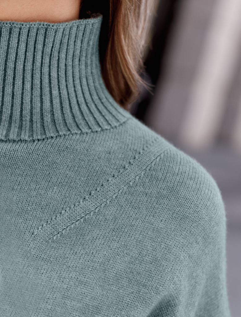 Платье с воротом стойка выполнено из мягкой меланжевой пряжи с кашемиром. Модель свободного силуэта со спущенным плечом хорошо впишется в расслабленные осенне-зимние аутфиты с высокими сапогами. Изделие очень приятное к телу, совершенно не колется и отлично сохраняет тепло при этом не перегревая.