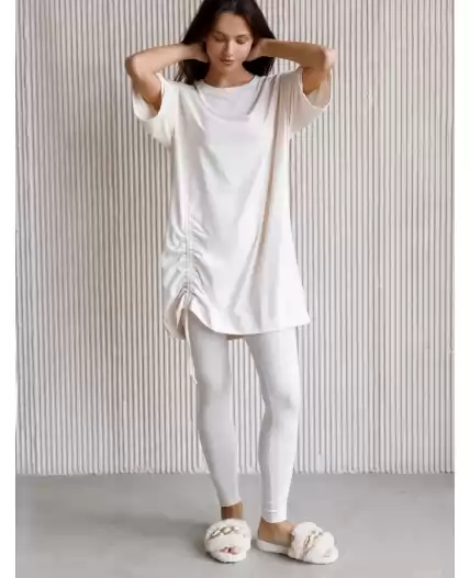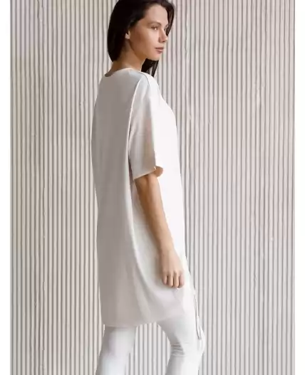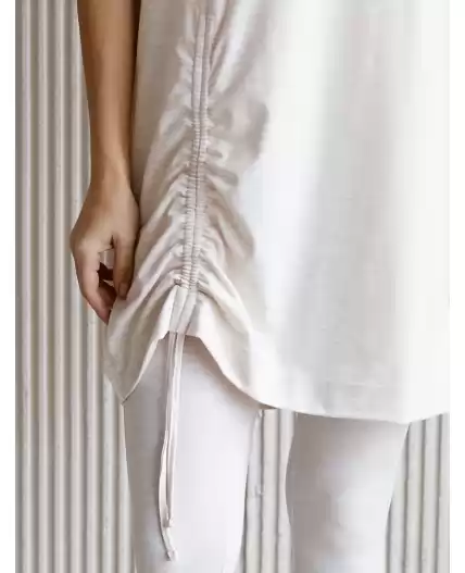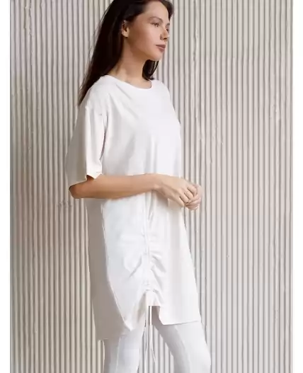Платье-туника свободного кроя выполнено из премиального хлопка с эластаном. Трендовой асимметричности изделию добавляет боковая вертикальная кулиска со шнуром из основного полотна. Хлопковый дышащий материал позволяет коже поддерживать оптимальный микроклимат. Сочетается в костюме с леггинсами D44.131