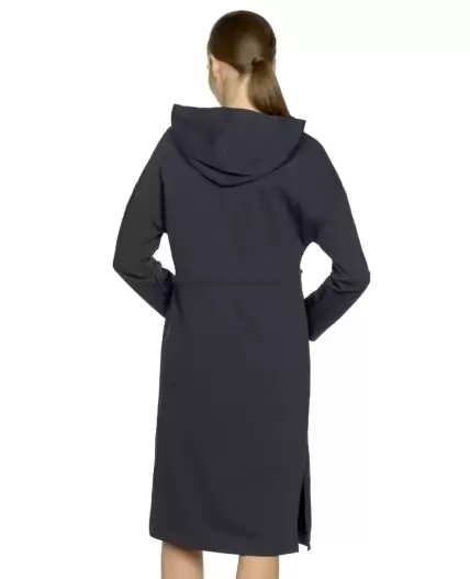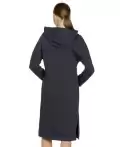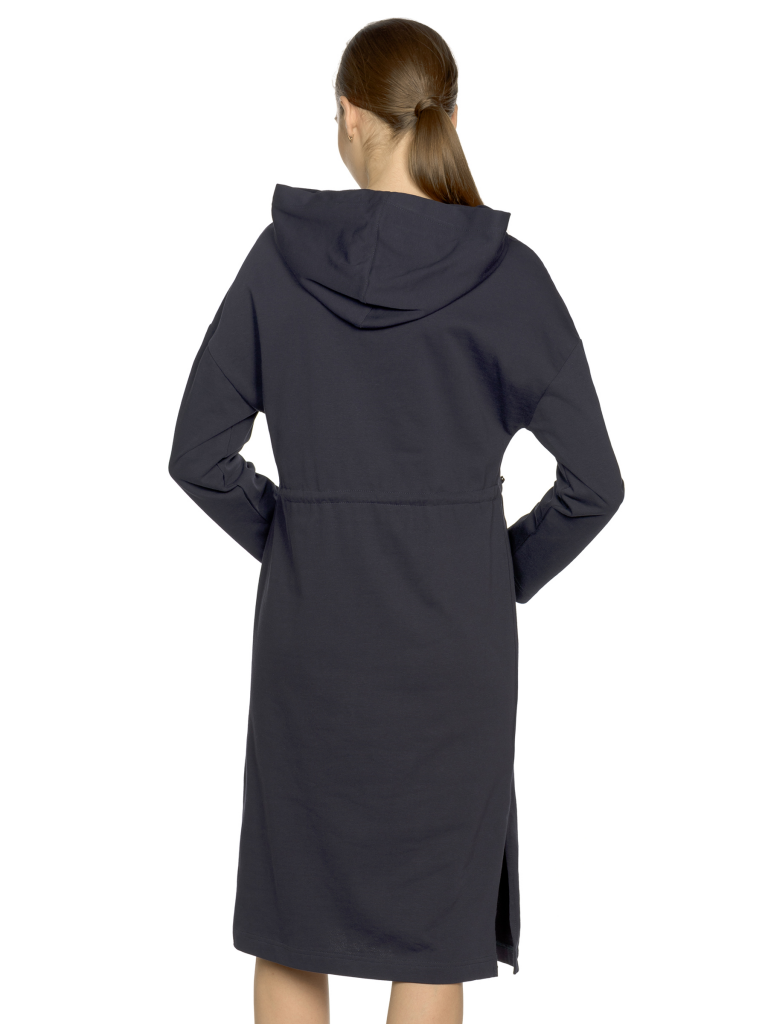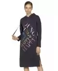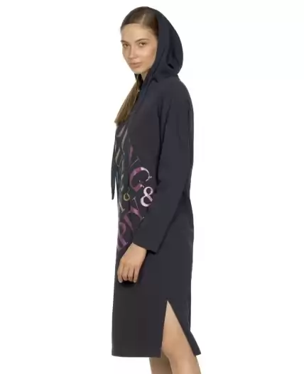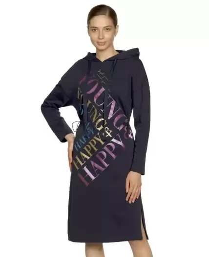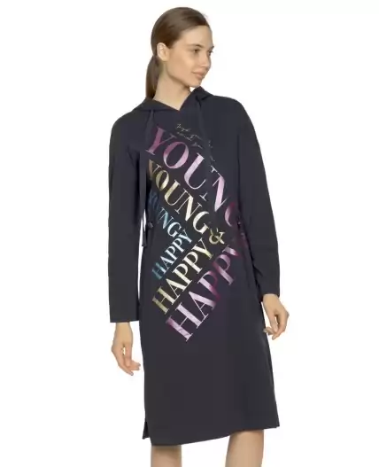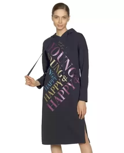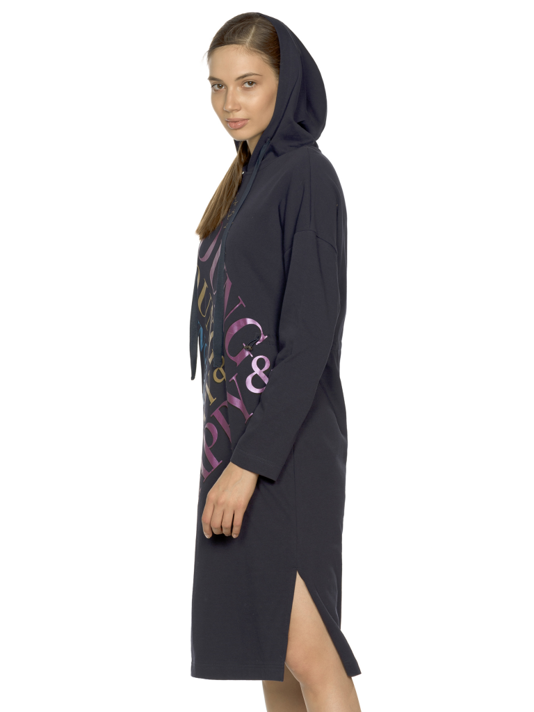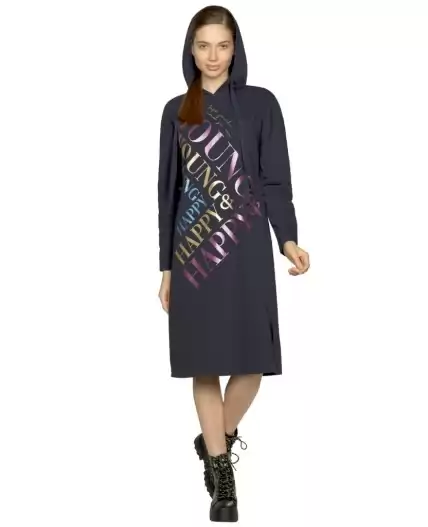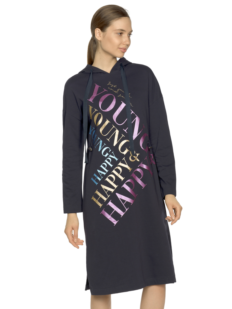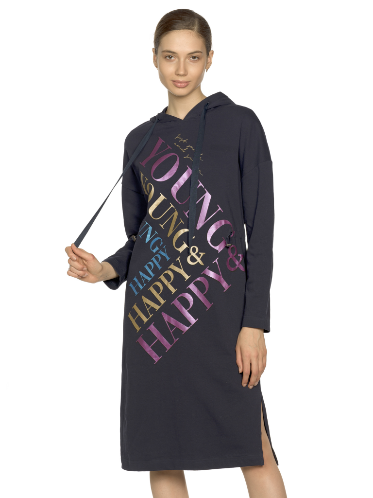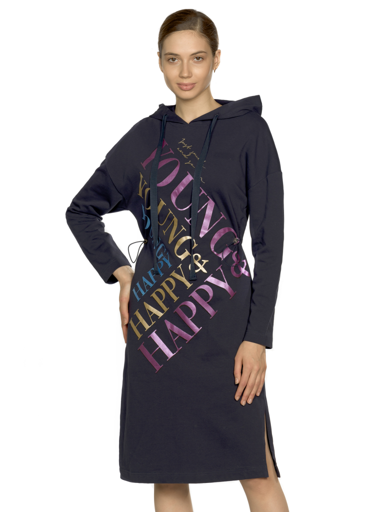 Платье женское. Модель прямого, в меру объёмного платья с аккуратным капюшоном, в кулиске которого репсовая лента для регулировки объёма. Кулиска на талии добавляет женственности, объём регулируется эластиком и фиксаторами. Линия плеча сильно спущена, в боковых швах разрезы 22 см. Шрифтовой принт разных оттенков металликов в сочетании с тёплым золотом rubber. Перевод Молода и счастлива.