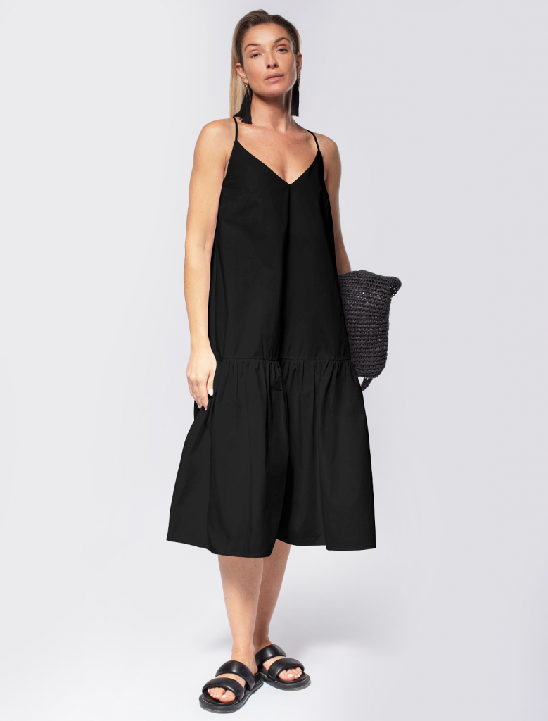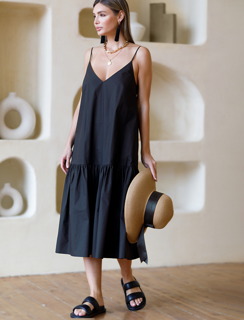 Платье-сарафан выполнено из поплина. Свободный силуэт не сковывает движений и подходит абсолютно всем. Натуральный состав ткани обладает высокой воздухопроницаемостью, а также способностью поглощать и отдавать влагу. Подходит для повседневной носки, гарантируя абсолютный комфорт. Длина изделия в данной модели измеряется по спинке.