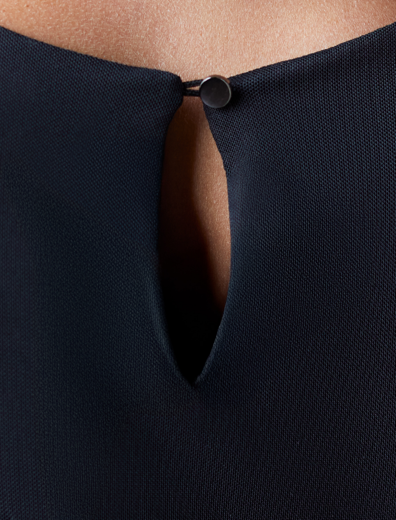 Элегантное платье прямого кроя черного цвета выполнено из воздушной сетчатой ткани с прозрачными рукавами, придающими образу лёгкую игривость. Мягкая вискозная подкладка обеспечивает комфорт, сохраняя при этом эффект полупрозрачности. Универсальный черный цвет делает платье идеальным для базового гардероба.