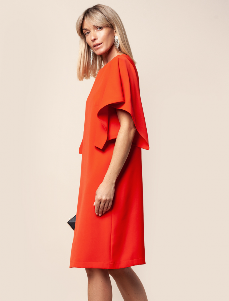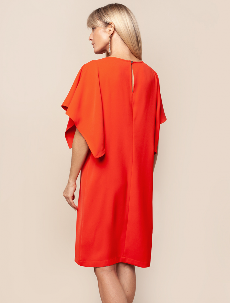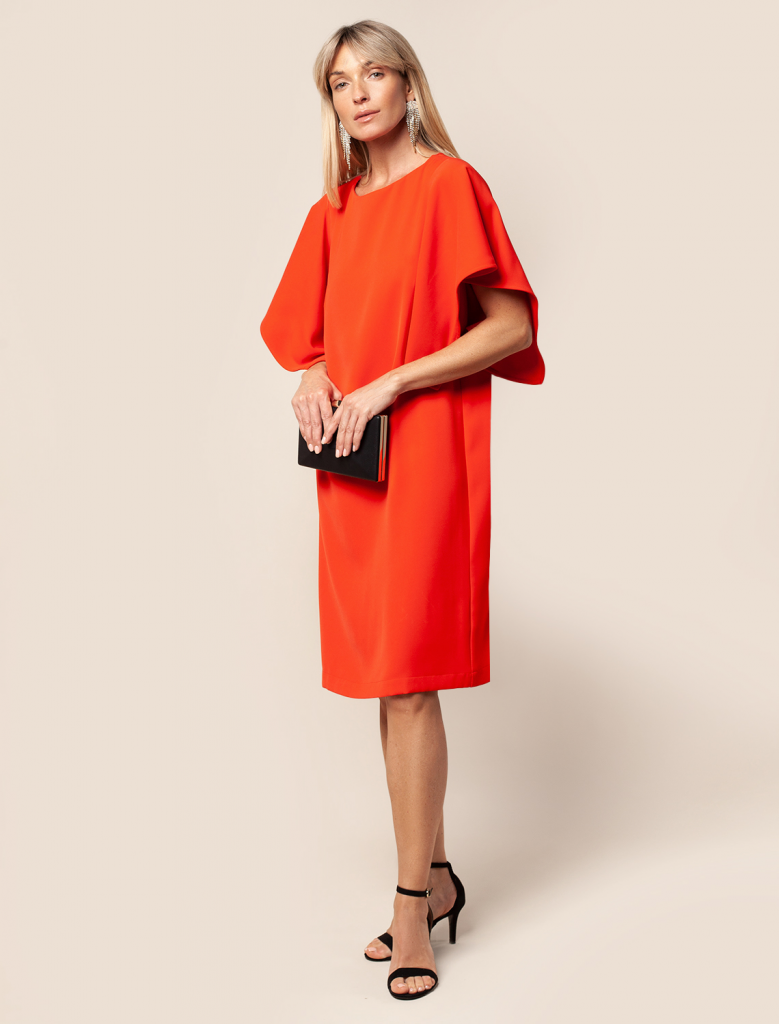 Платье из плотного струящегося крепа прямого кроя с «парящими» рукавами. Фасон платья сбалансирует любой тип фигуры: прямой свободный крой, универсальная длина подола – чуть ниже колена, широкая пройма и акцентные рукава. Классический О-образный вырез фиксируется сзади изящной золотой пуговицей. Материал почти не мнется и комфортен в носке.