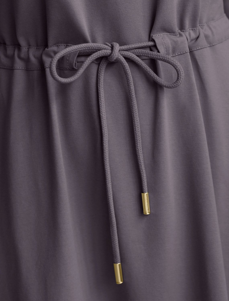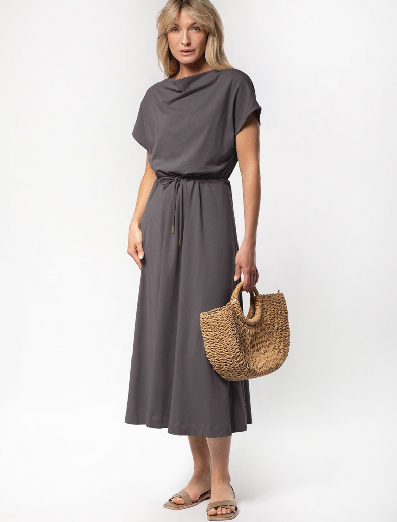 Платье с цельнокроеным рукавом выполнено из премиального хлопка с эластаном. Лаконичная модель свободного кроя, за счет ворота формы лодочка и пояса на талии, создает плавную драпировку ткани, словно в греческом стиле. Подходит для любой фигуры. Изделие дополнено металлическим логотипом бренда.