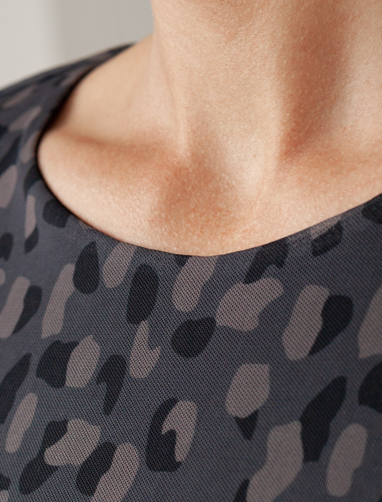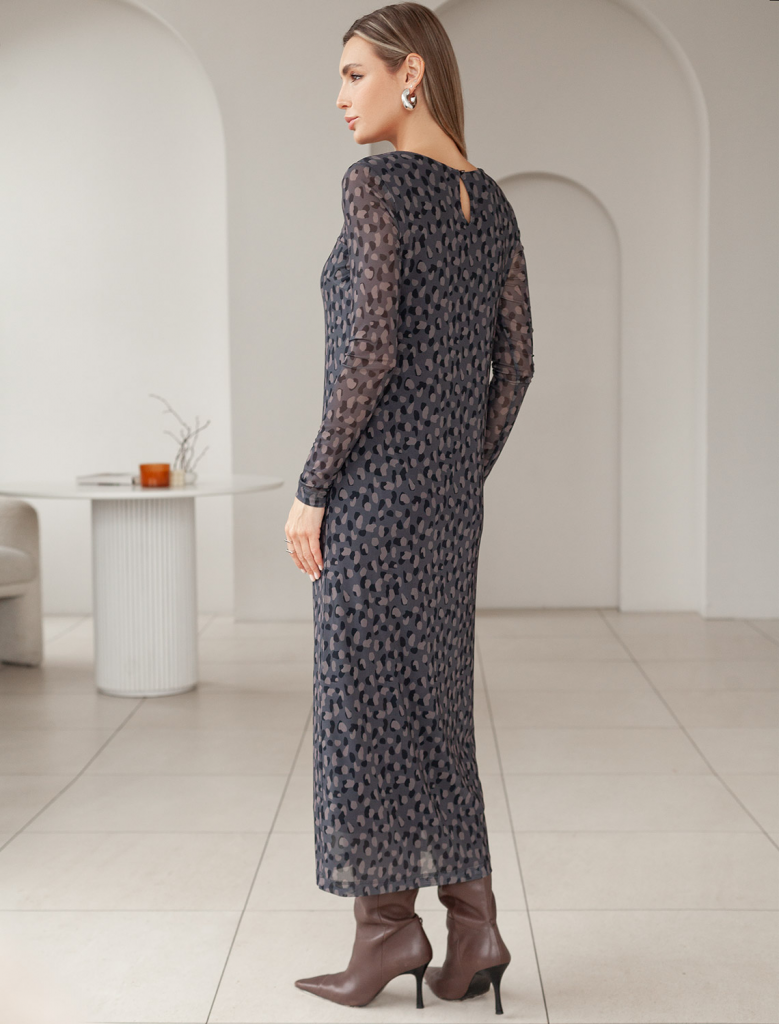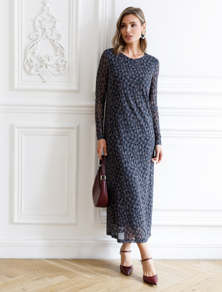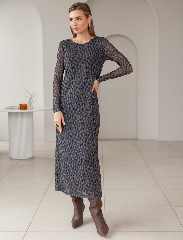 Элегантное платье прямого кроя из благородного серо-коричневого оттенка выполнено из воздушной сетчатой ткани с прозрачными рукавами, придающими образу лёгкую игривость. Мягкая вискозная подкладка обеспечивает комфорт, сохраняя при этом эффект полупрозрачности. Благородный серо-коричневый оттенок делает платье идеальным для базового гардероба.