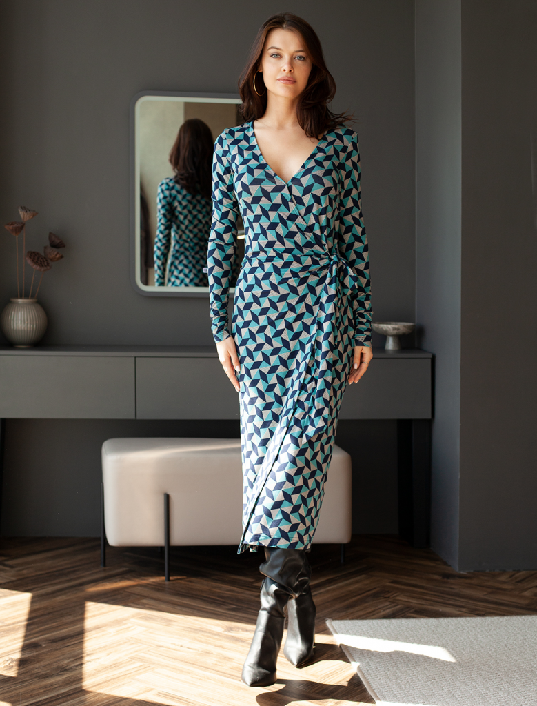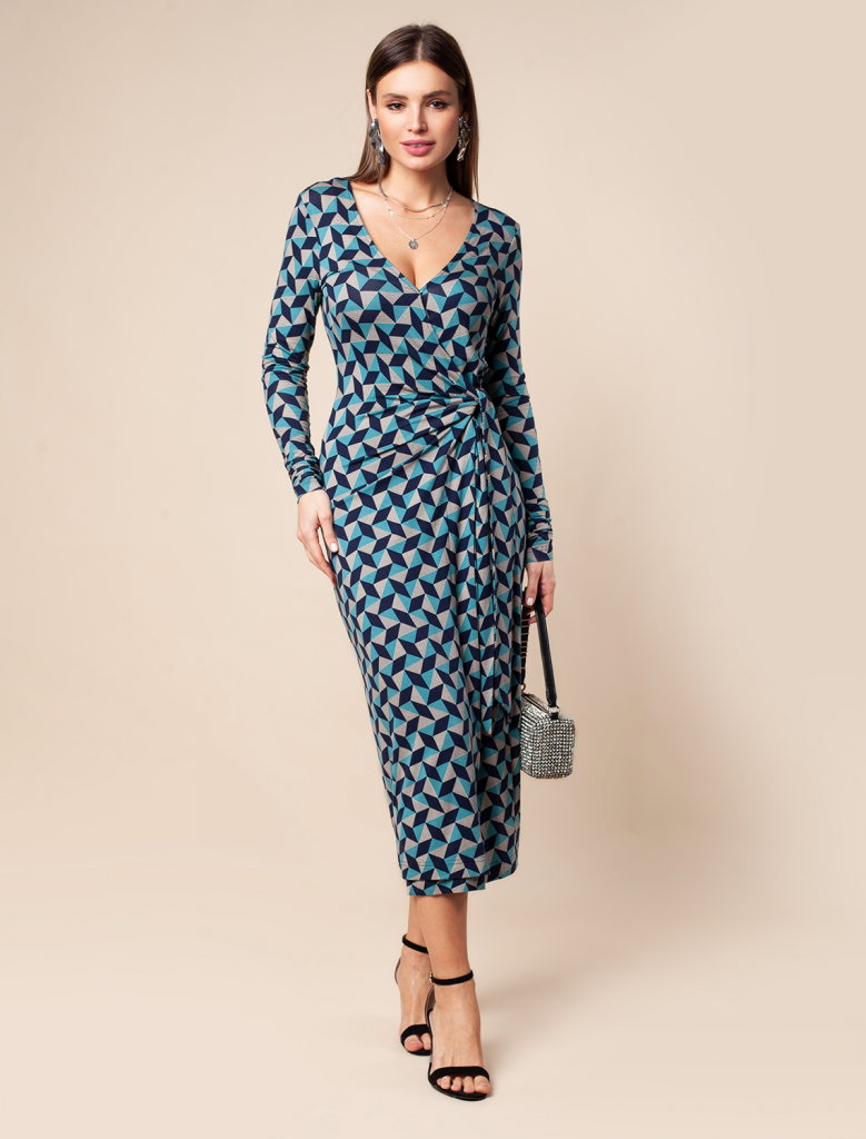 Платье на запАх сшито из трикотажной вискозы с эластаном. V-вырез с мини-копкой на борте с внутренней стороны для фиксации выреза декольте. Запах сходится и завязывается на боковой-пояс ленту. Модель подчеркивает достоинства и изгибы фигуры. А геометрический принт скрывает любые неровности. Роскошь и комфорт, одновременно подчеркивающие стиль, женственность и красоту.
