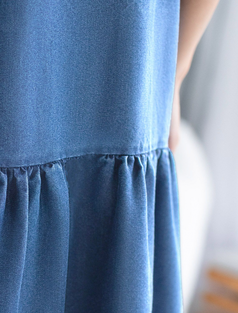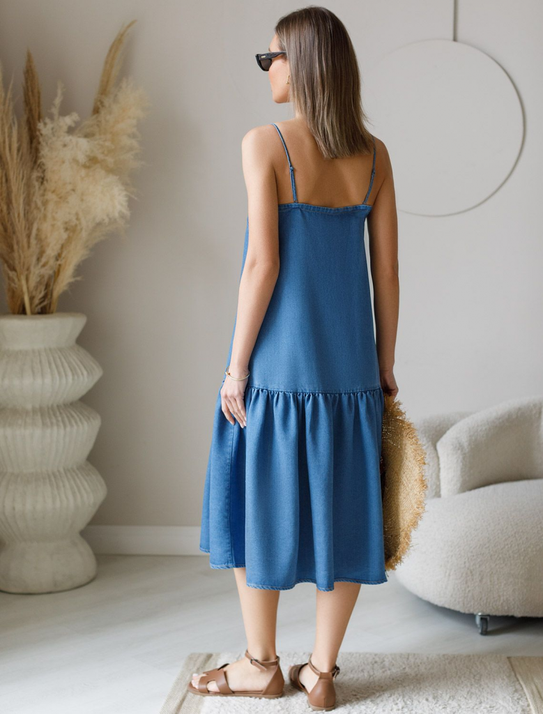 Сарафан выполнен из лиоцелла. Модель свободного кроя с пышным воланом по низу дополнена регулируемыми бретелями. Ткань с характерным атласным блеском полностью имитирует обычный деним, но в тоже время намного более мягкая, плавно струится по телу, хорошо драпируется и охлаждает кожу в жаркое время года.