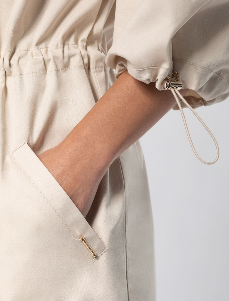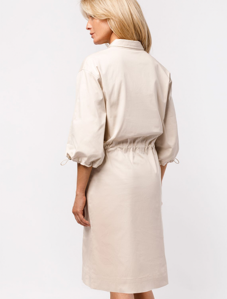 Платье в стиле сафари выполнено из тонкого хлопкового твила. Пышные рукава и пояс на кулисе с регуляторами. Модель дополнена боковыми карманами и застежкой на золотистые пуговицы. Благодаря наличию эластана в составе, изделие сохранит свой безупречный внешний вид в течении долгого времени. Обладает высокой воздухопроницаемостью, благодаря в платье будет комфортно даже в жаркое время года.