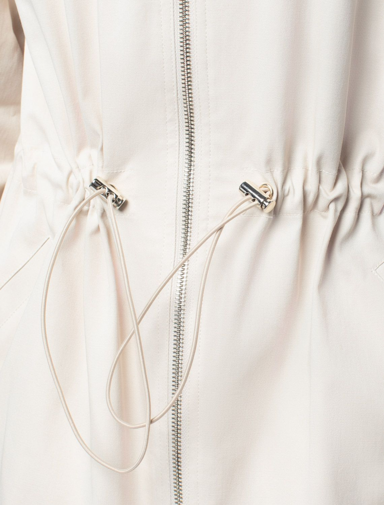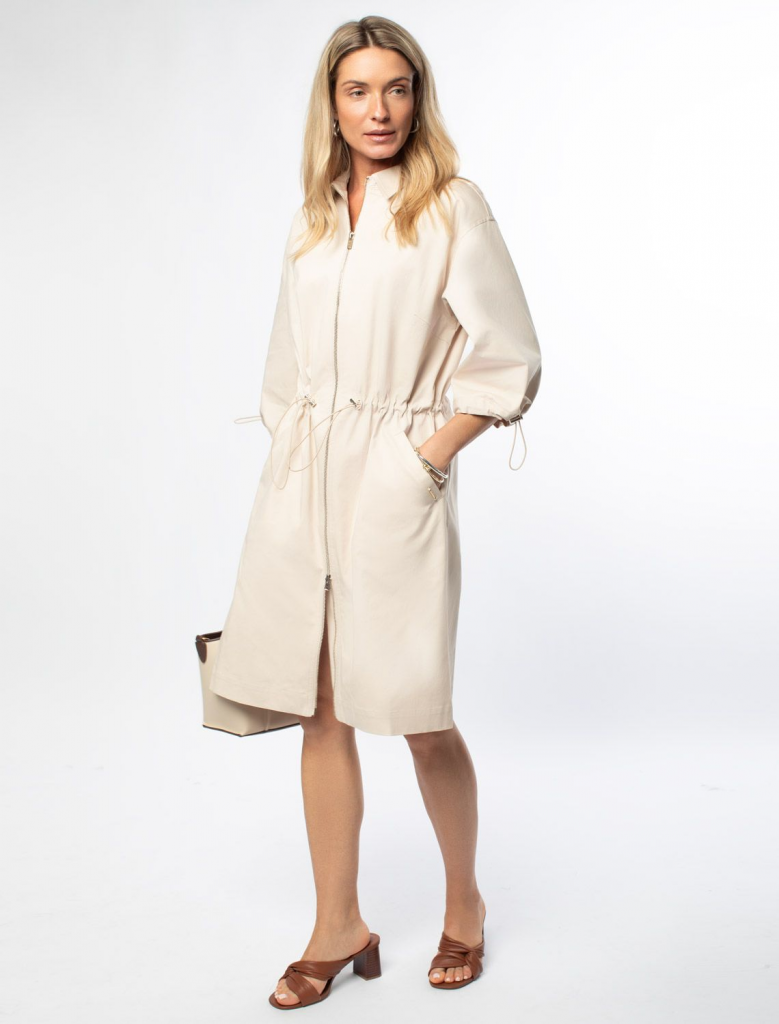 Платье в стиле сафари выполнено из хлопкового твила. Посадка и объем рукава регулируются с помощью металлических стоперов. Модель дополнена боковыми карманами и золотистой застежкой на молнию. Благодаря наличию эластана в составе изделие сохранит свой безупречный внешний вид в течение долгого времени. Обладает высокой воздухопроницаемостью, в платье будет комфортно даже в жаркое время года.