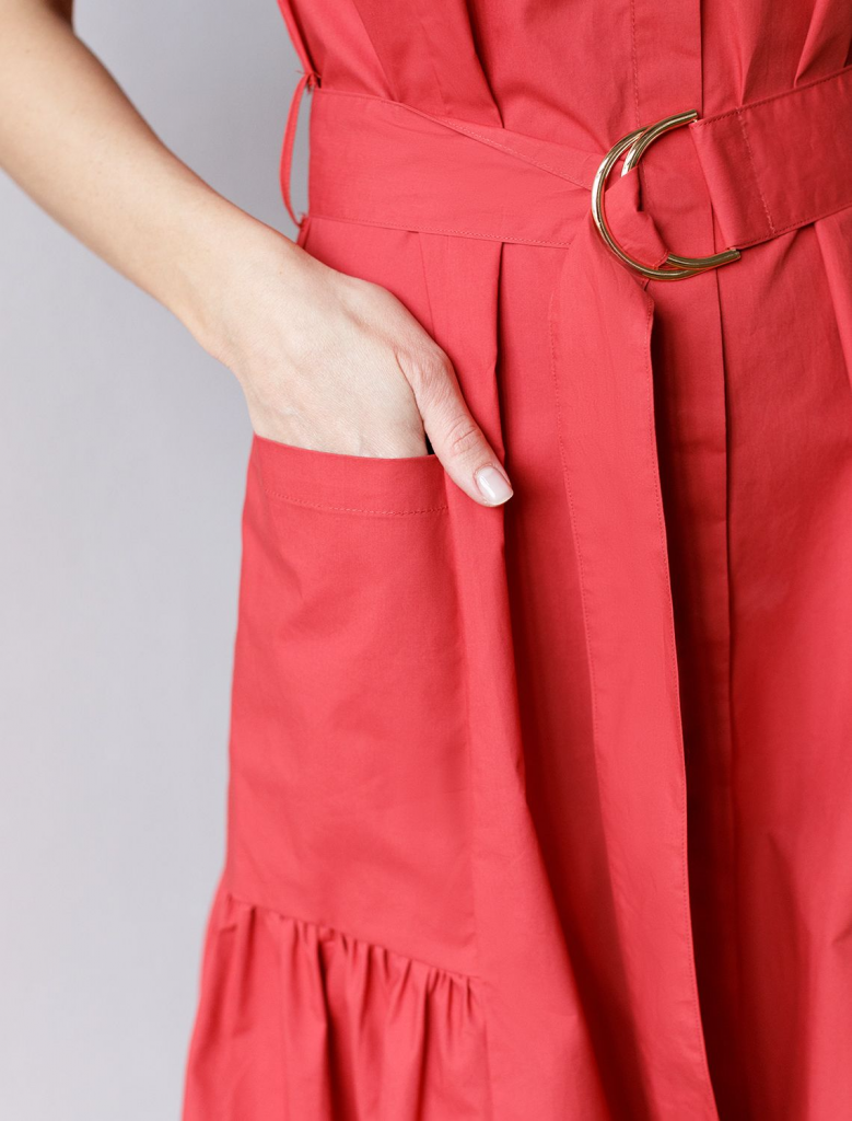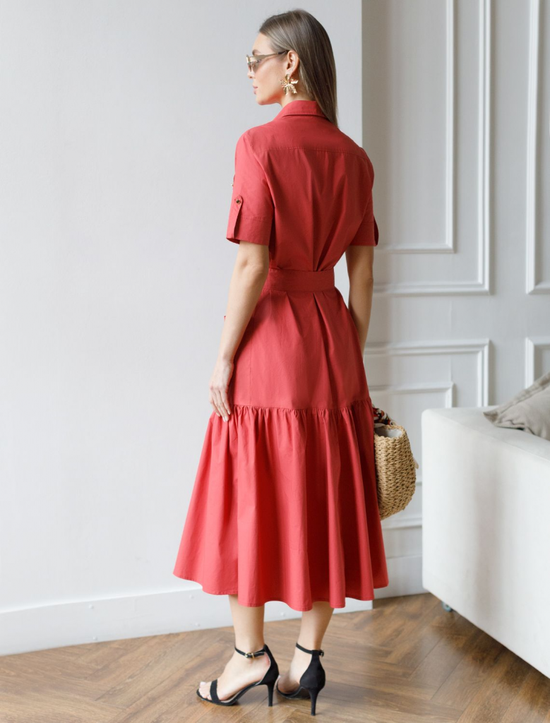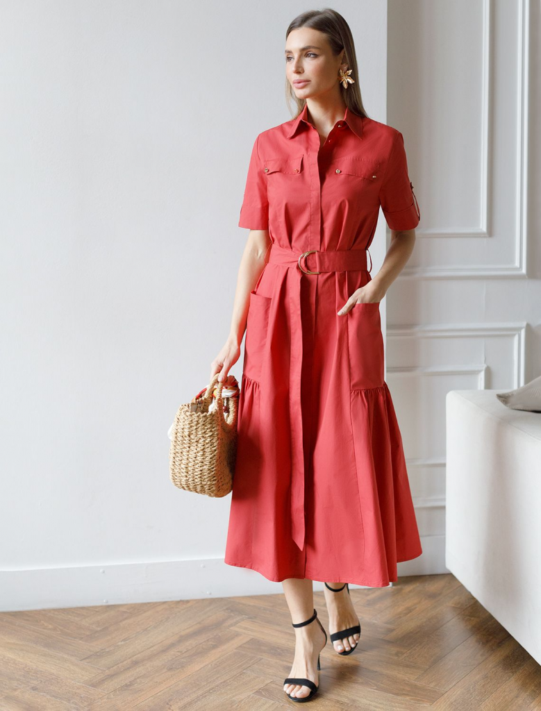 Платье-рубашка выполнено из легкого хлопкового поплина. Модель с воздушной юбкой-воланном дополнена крупными накладными карманами и поясом из основного полотна с золотистой фурнитурой. Благодаря силуэту в стиле new-look изделие моментально сделает образ женственным и романтичным. Натуральный состав ткани обладает высокой воздухопроницаемостью и гигроскопичностью. В изделии будет комфортно, даже в самое жаркое время года. Подходит для любой фигуры.