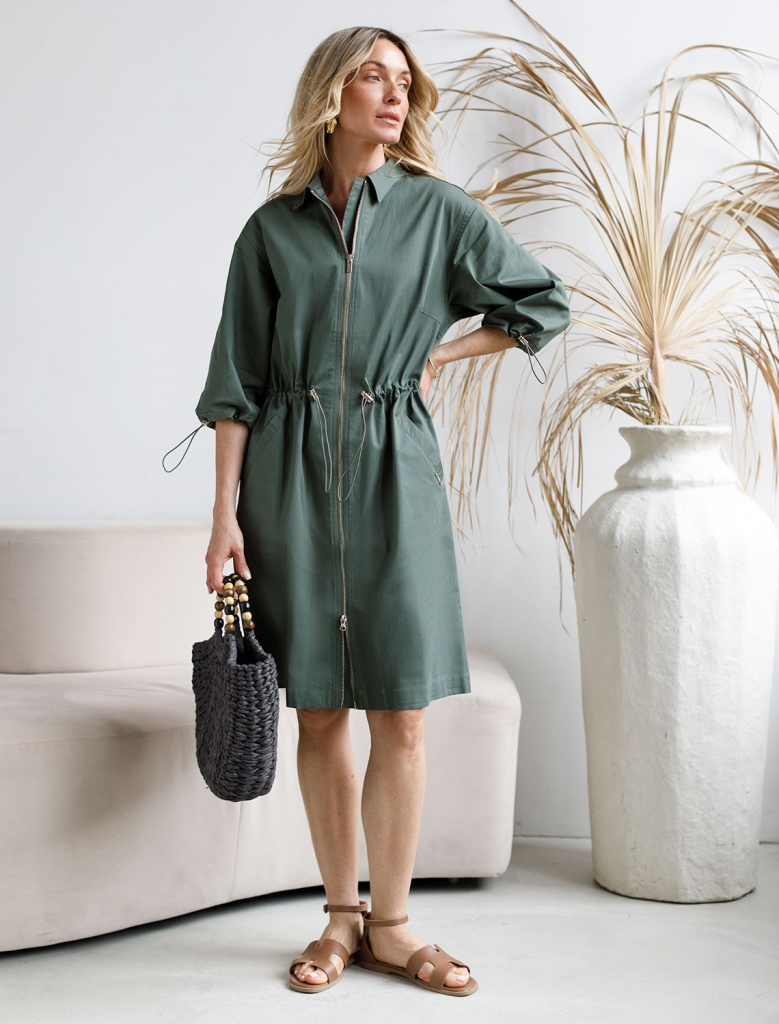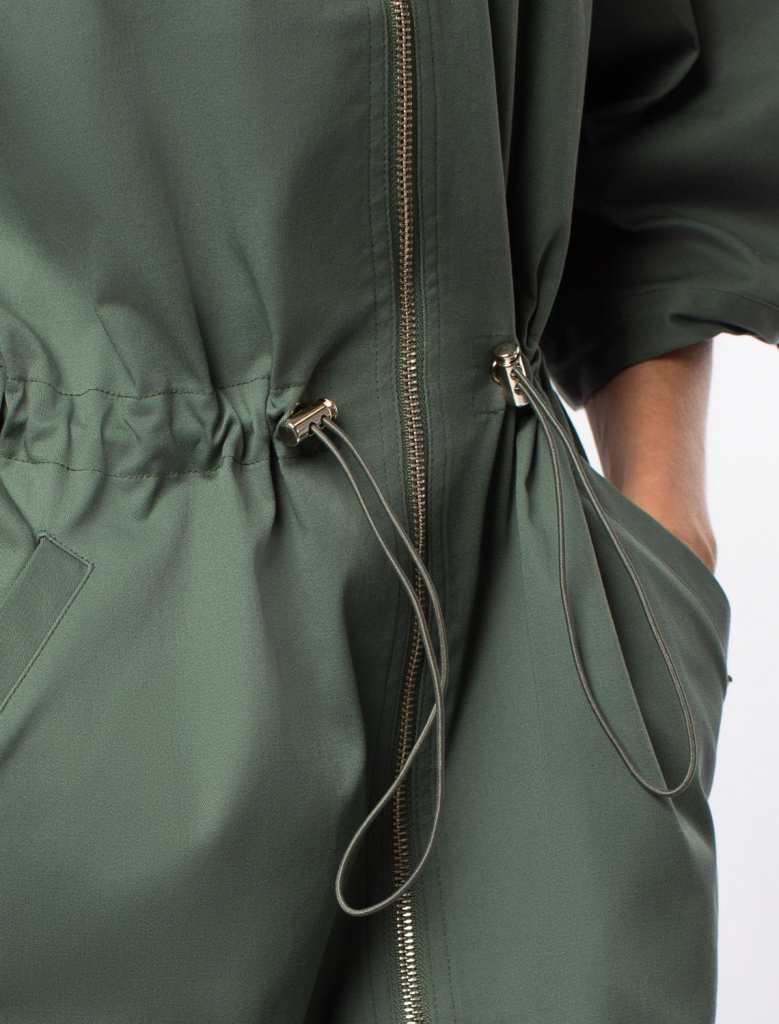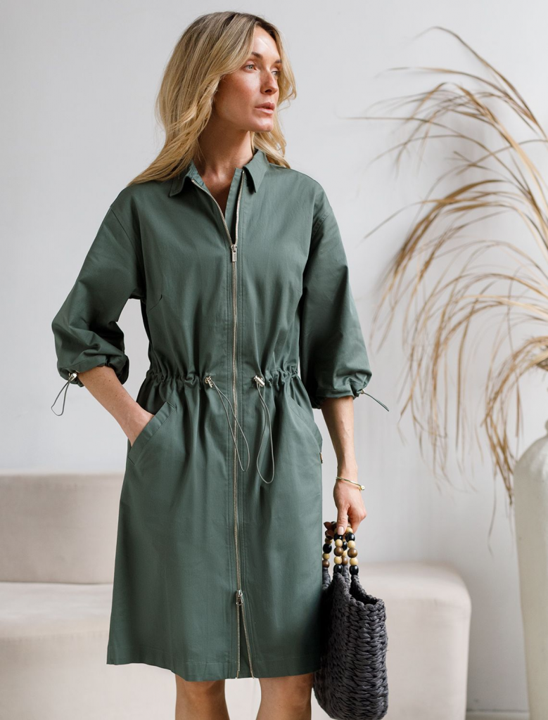 Платье в стиле сафари выполнено из хлопкового твила. Посадка и объем рукава регулируются с помощью металлических стоперов. Модель дополнена боковыми карманами и золотистой застежкой на молнию. Благодаря наличию эластана в составе изделие сохранит свой безупречный внешний вид в течение долгого времени. Обладает высокой воздухопроницаемостью, в платье будет комфортно даже в жаркое время года.