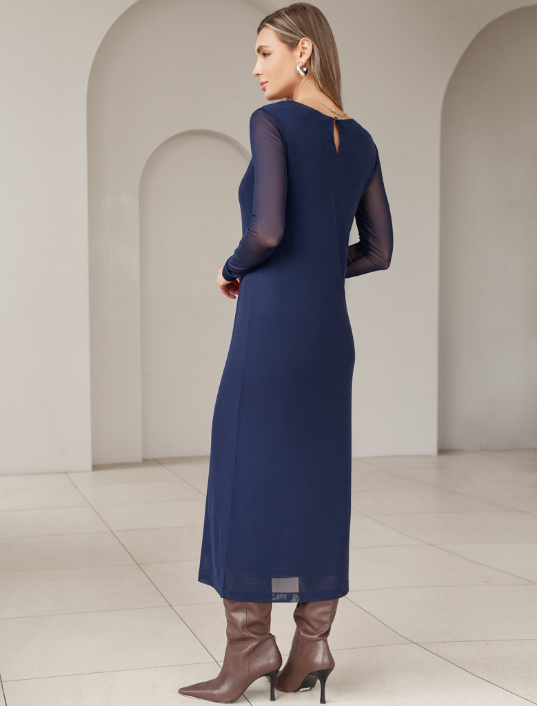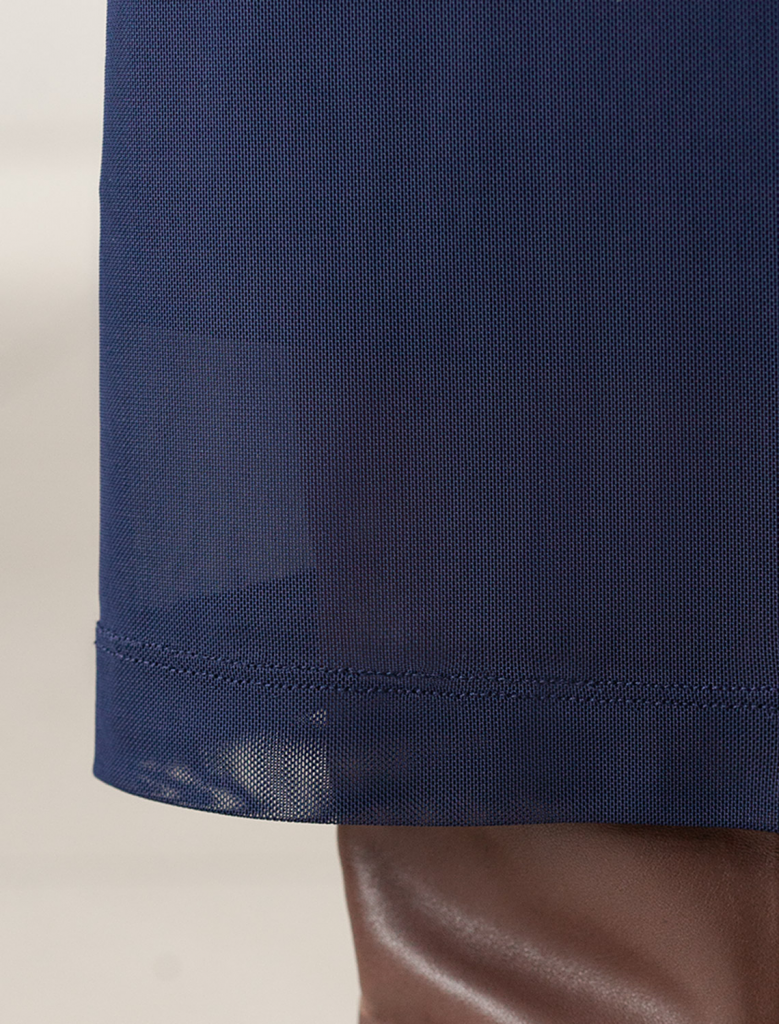 Модель выполнена из воздушной сетчатой ткани с вискозной подкладкой, которая подчеркивает фигуру. Прямой крой создает стройный силуэт. Богатый темно-синий цвет создает эффект глубины и роскоши. Прозрачные рукава добавляяют образу пикантности. Идеально подходит как для вечерних выходов, так и для повседневного образа.