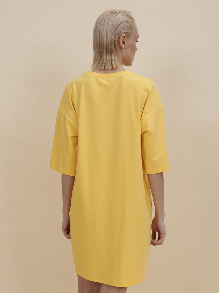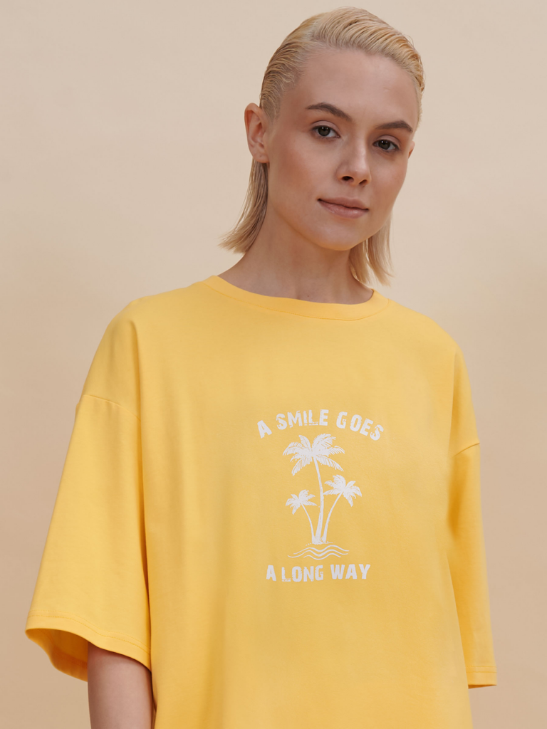Стильное женское летнее платье футболка длиной до колена. Трикотажное платье оверсайз прямого кроя с коротким рукавом. Однотонное платье-футболка с принтом – базовый элемент женского гардероба. Повседневное платье свободного кроя подойдет для любой фигуры. В составе ткани изделия преобладает высококачественный хлопок – платье мягкое и отлично пропускает воздух, позволяя коже дышать. Принт с летним настроением, надпись переводится: "Улыбка помогает". Принт эластичный и мягкий, отлично переносит многочисленные стирки. В линейке представлены следующие размеры: XS (42), S (44), M (46), L (48), XL (50). Просторное платье в спортивном стиле подходит как женщинам, так и девушкам, девочкам-подросткам. Модель представлена в двух актуальных цветах: голубом и жёлтом. Свободное платье оверсайз идеально для носки дома, комфортного сна, пижамной вечеринки. Платье майка подходит для повседневного летнего гардероба, прогулок, отдыха, пляжа. А также модель удобна для беременных. Женское платье-футболка – чудесный подарок для мамы, сестры или подруги на любой праздник. Выбирайте нужный размер по таблице размеров на фото. Цвет товара на экране вашего устройства может отличаться от цвета изделия вживую.