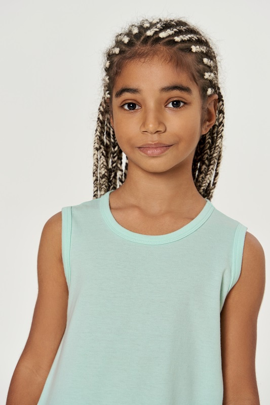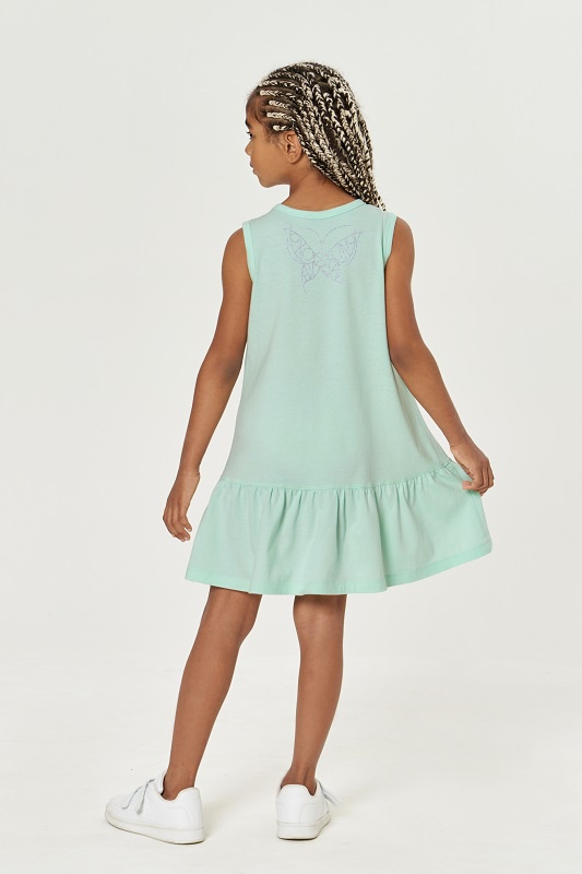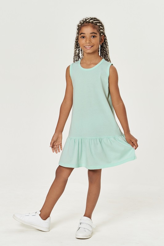 Платье для девочек. Свободного силуэта, отрезное по низу, с оборкой. Горловина и проймы окантованы бейкой из рибаны.