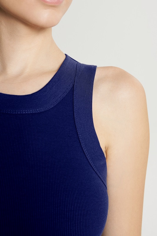 Платье средней длины из кашкорсе, облегающего силуэта, с широкой окантовкой пройм и горловины из рибаны.