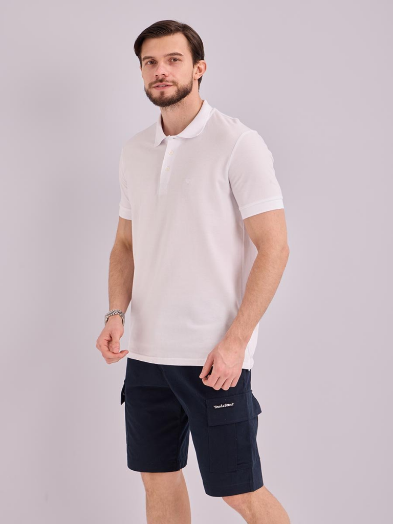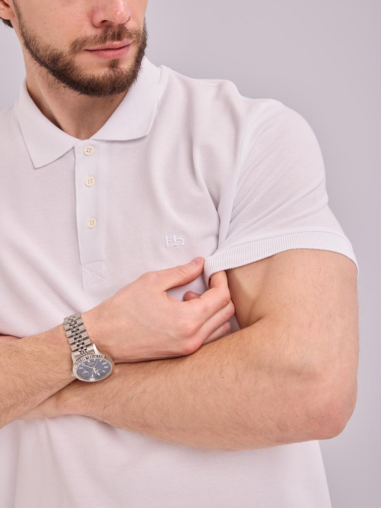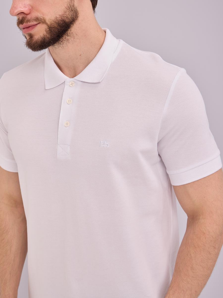 Классическая мужская футболка поло F5, Regular fit (полуприлегающий силуэт), с вышивкой-фирменным логотипом. Выполнена из трикотажного полотна пике (pique). С отложным воротником и короткими рукавами. Застежка-планка застегивается на 3 пуговицы.