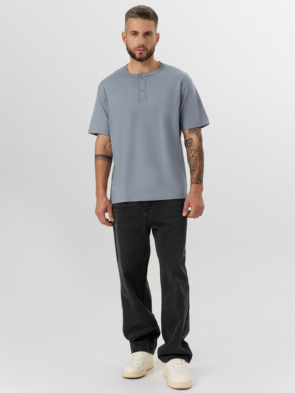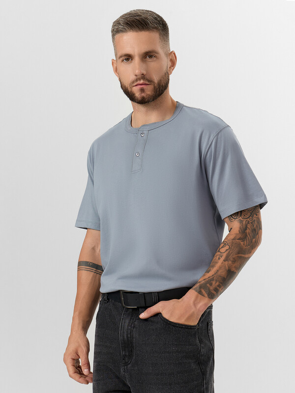 Отрезная воротник-стойка из рибаны. Боковой срез планки и верхний срез воротника-стойки обработан на оверлоке. Рукава короткие, втачные.По плечевым швам и окату рукава отделочные строчки. Нижние срезы рукавов и изделия обработаны швом вподгибку на плоскошовной машине.